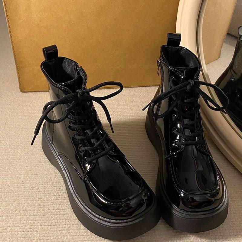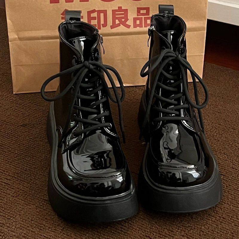 漆皮短靴马丁靴女25秋冬新款ins英伦风厚底增高爆款加绒圆头系带