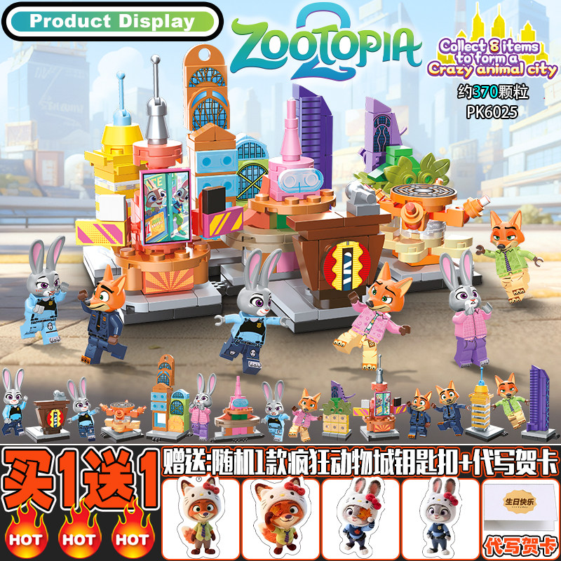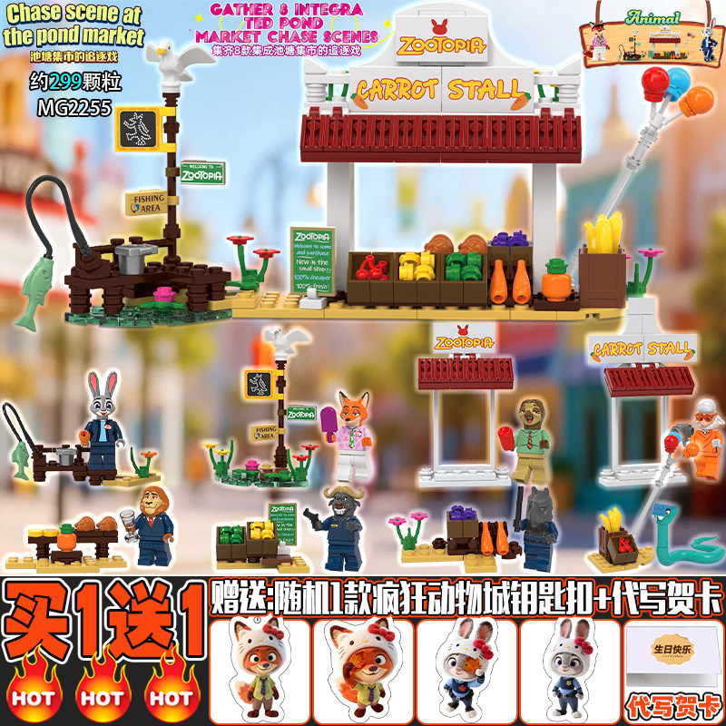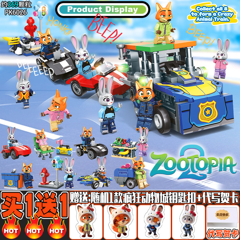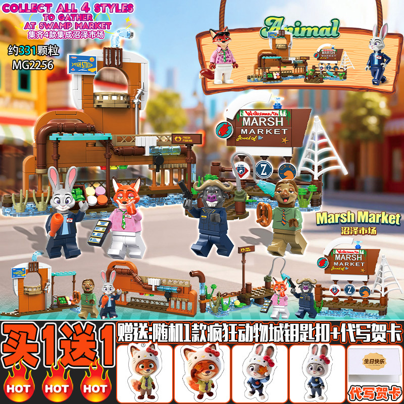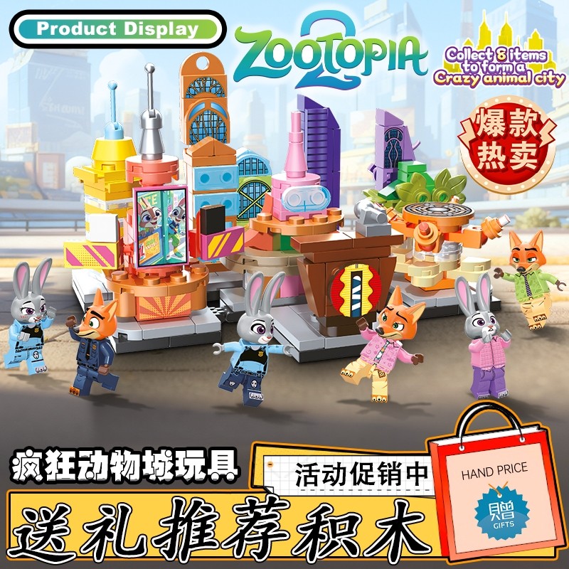 网红新款疯狂动物城都市积木池塘集市沼泽市场警车男女孩拼装玩具