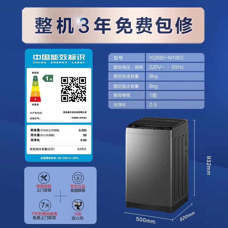 【官仓】海尔大神童8公斤波轮洗衣机羊毛除螨高洗净比M10E0旗舰店