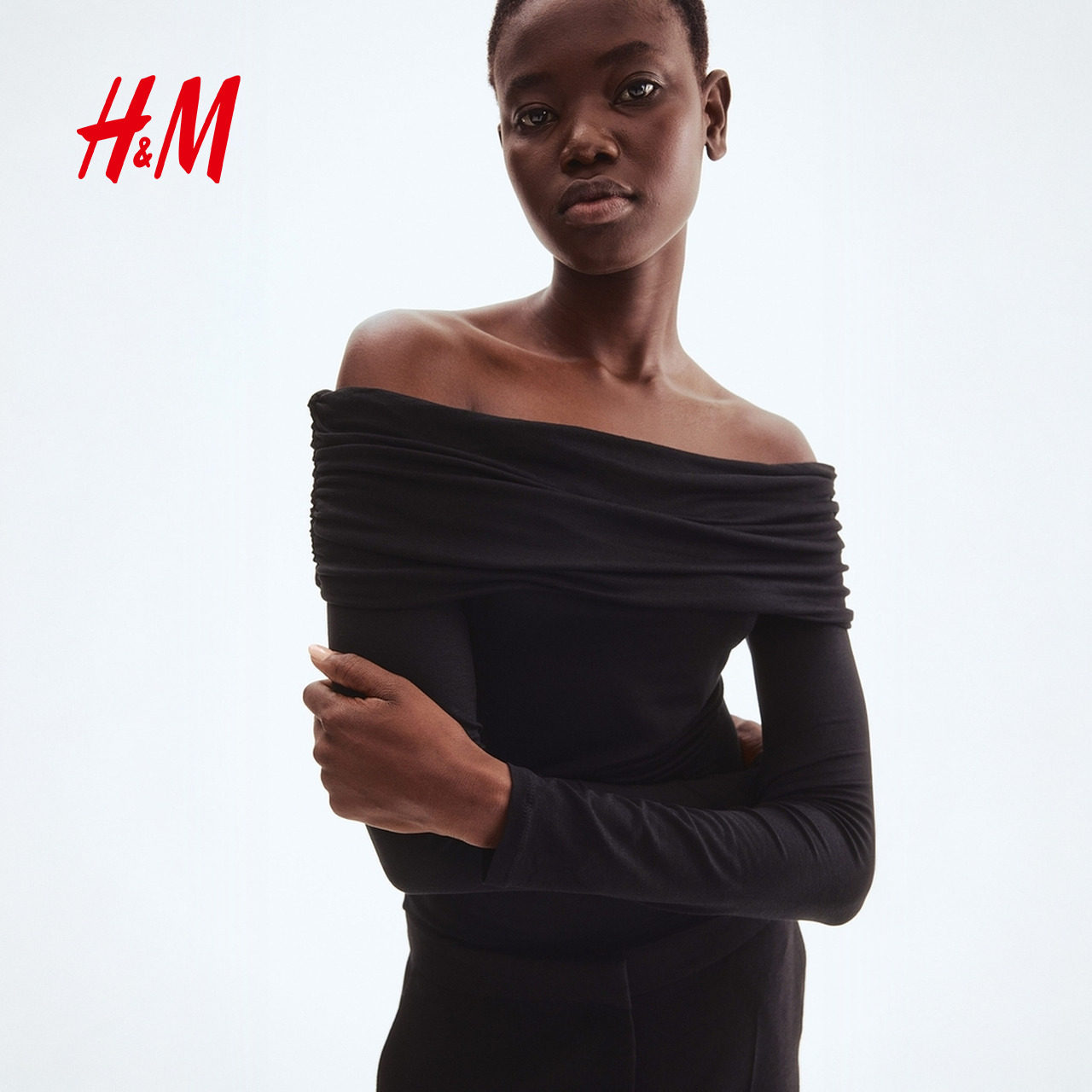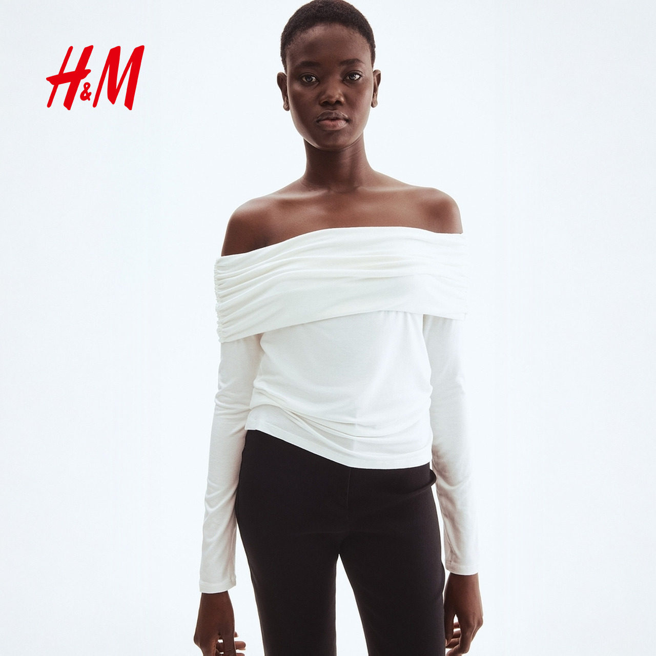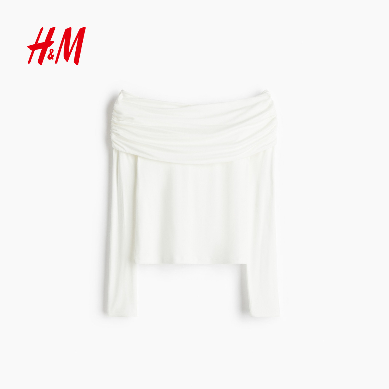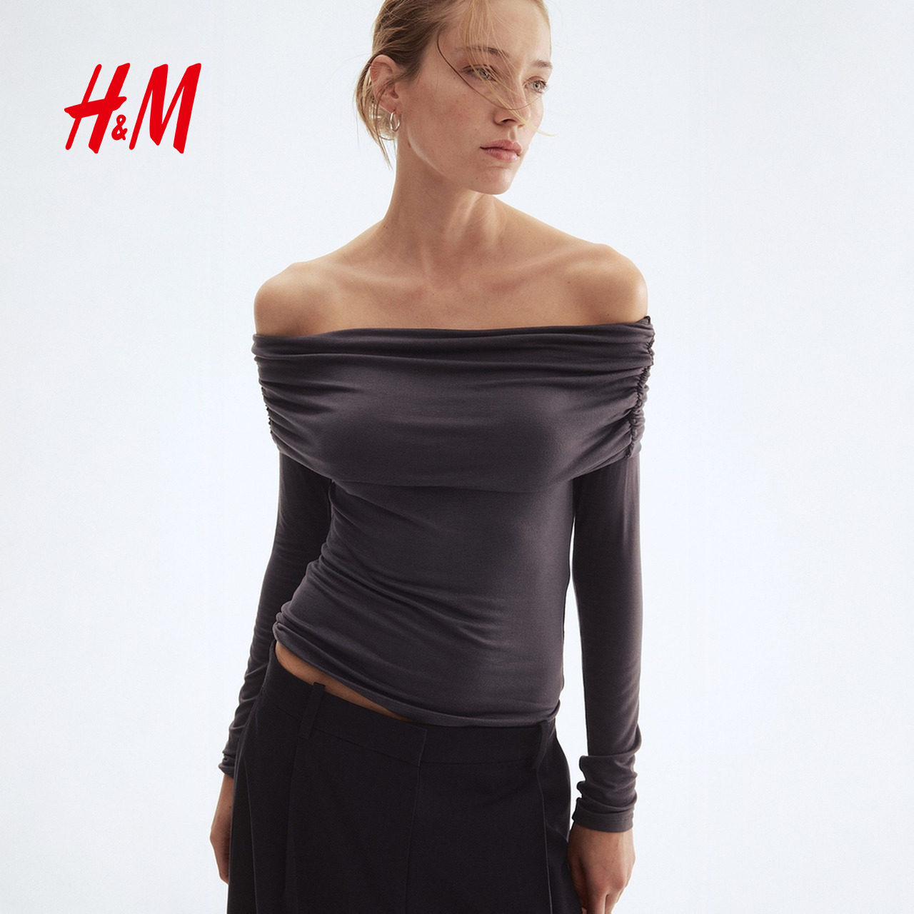 HM女装T恤2025冬季新款时尚休闲垂褶露肩弹力轻柔长袖上衣1301385