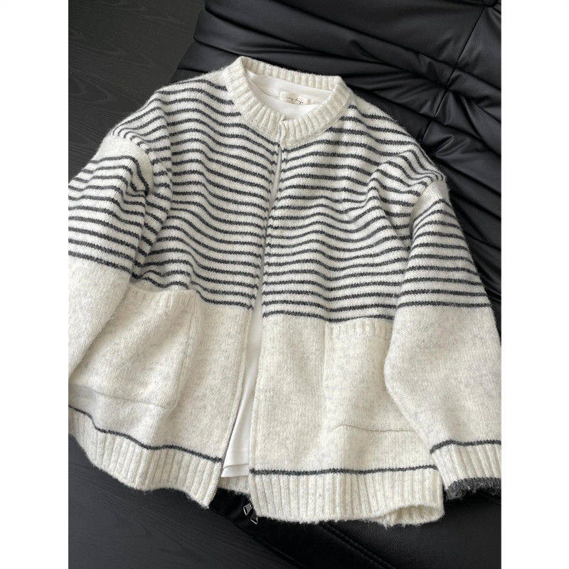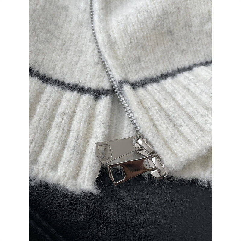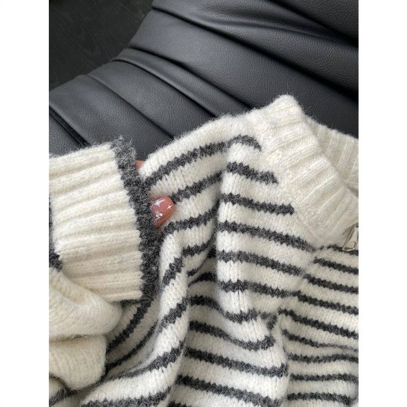 白色条纹拉链圆领毛衣开衫女秋冬慵懒风大码内搭针织衫上衣外套
