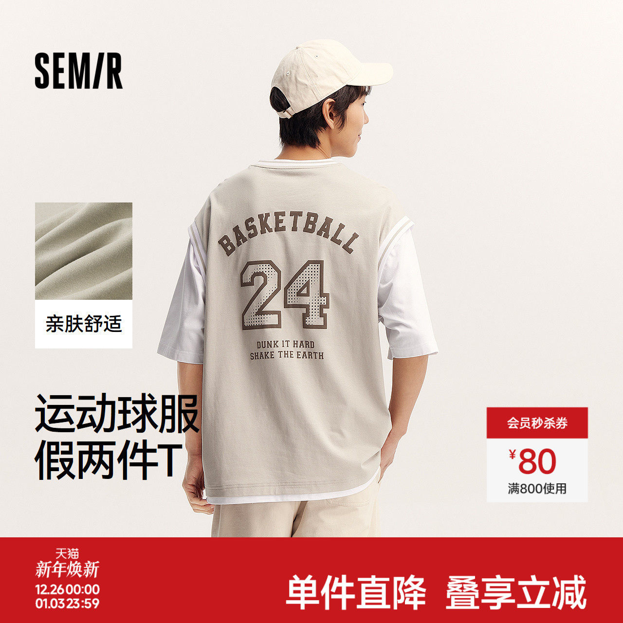森马短袖T恤男时尚假两件上衣夏季oversize运动球服潮流撞色印花