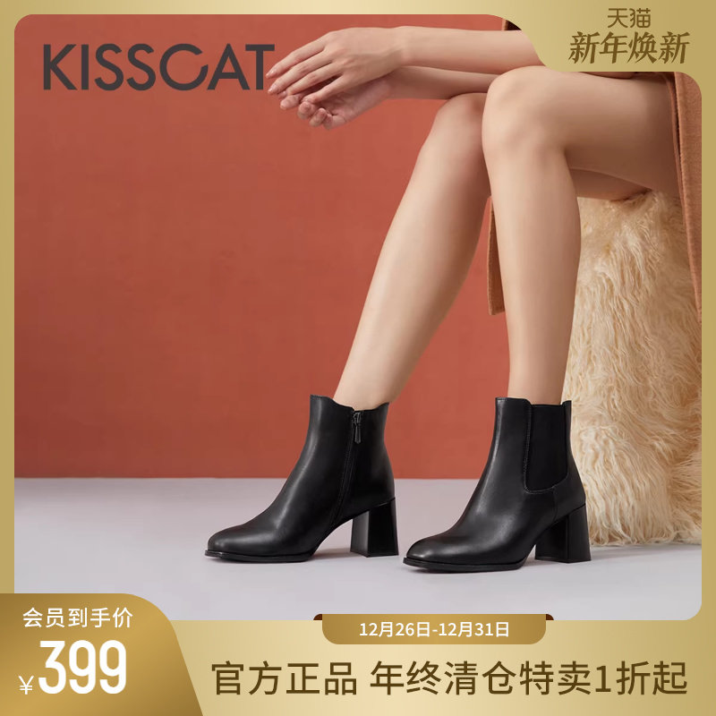 KISSCAT接吻猫秋季新款粗跟切尔西靴女真皮短靴通勤高跟靴时装靴