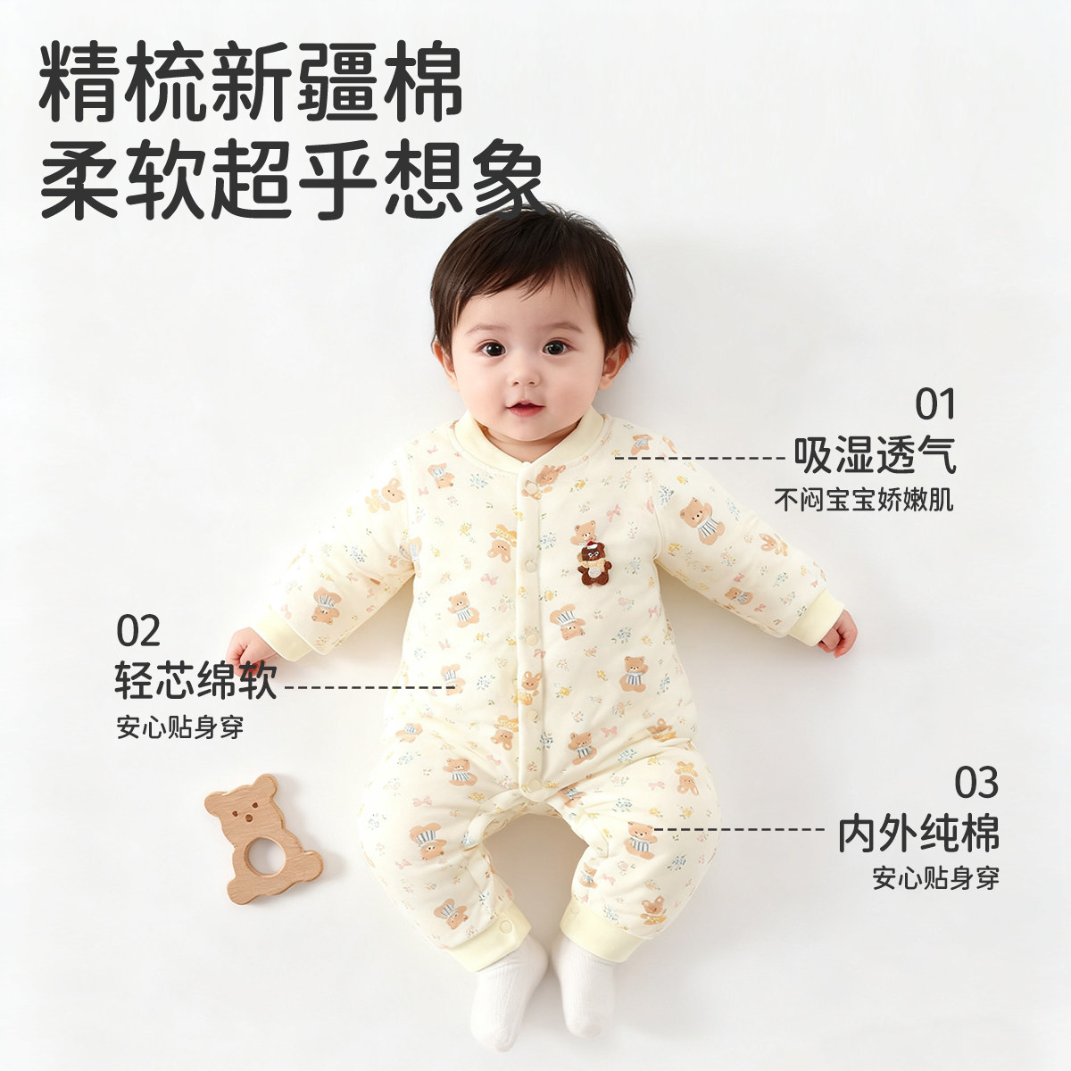 婧麒新生婴儿夹棉连体衣秋冬棉服宝宝保暖加厚哈衣婴幼儿冬季爬服
