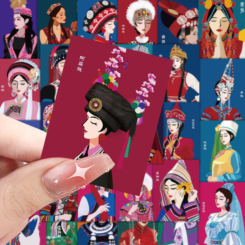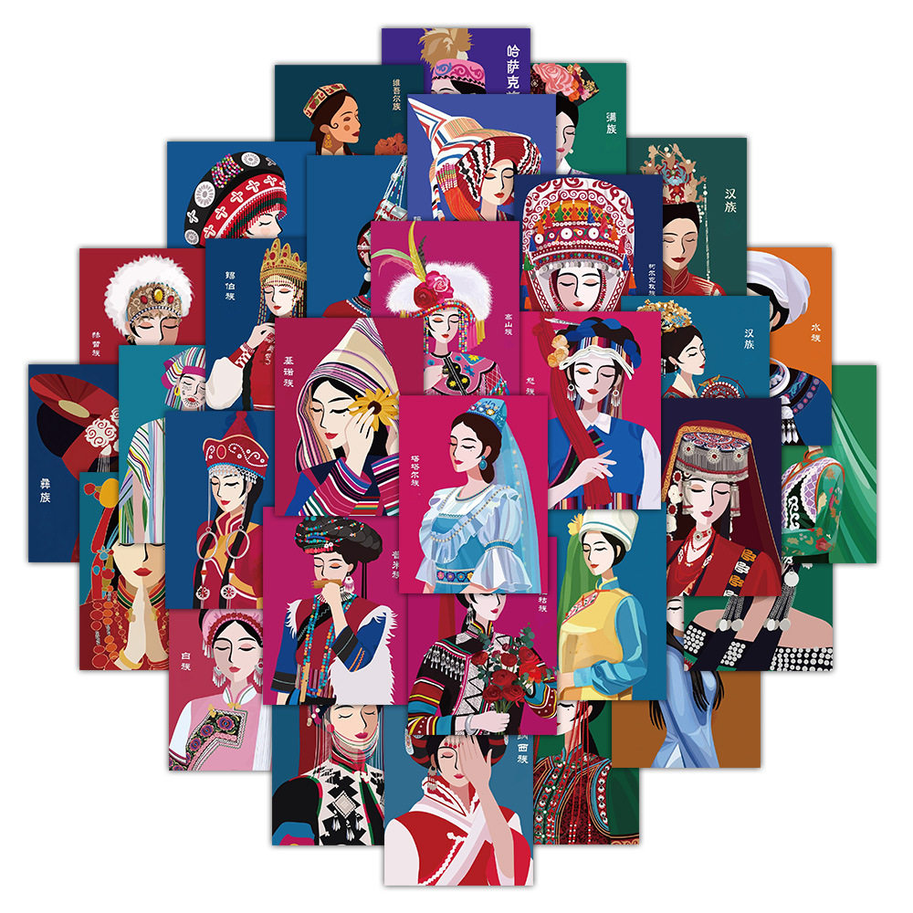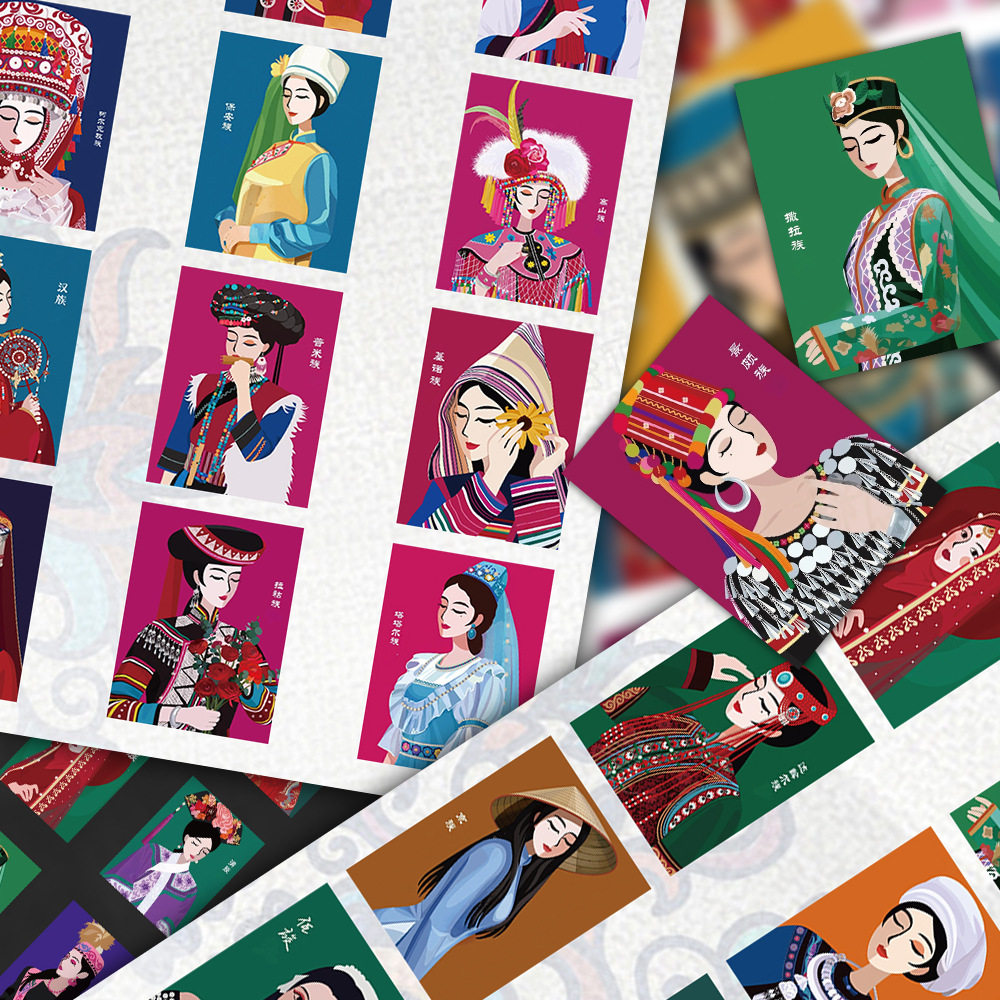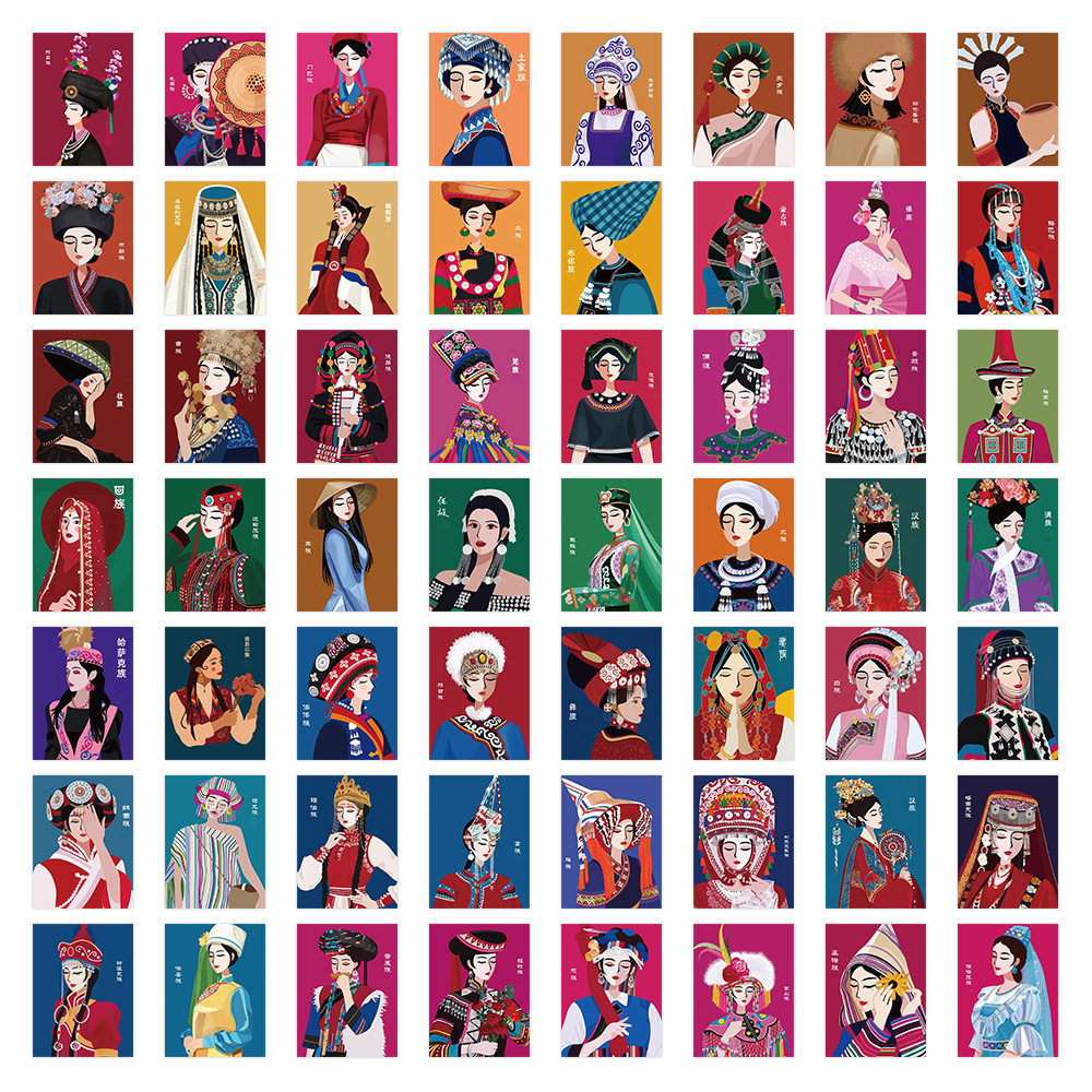 56贴民族服饰涂鸦贴纸复古系列少女人物手帐素材装饰笔记本文具贴