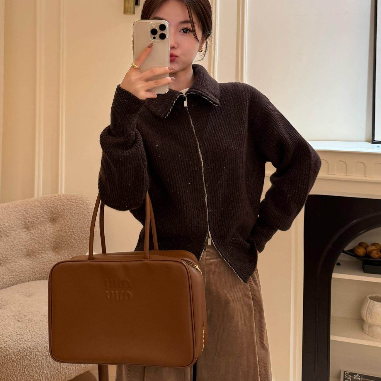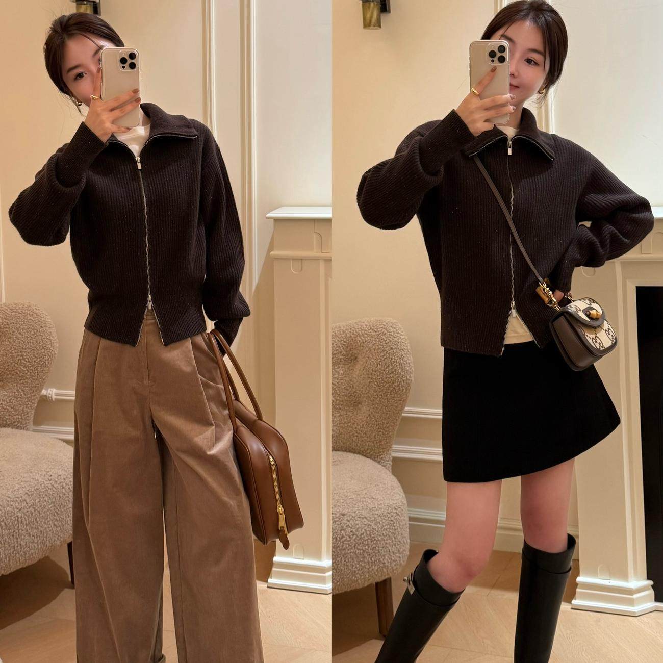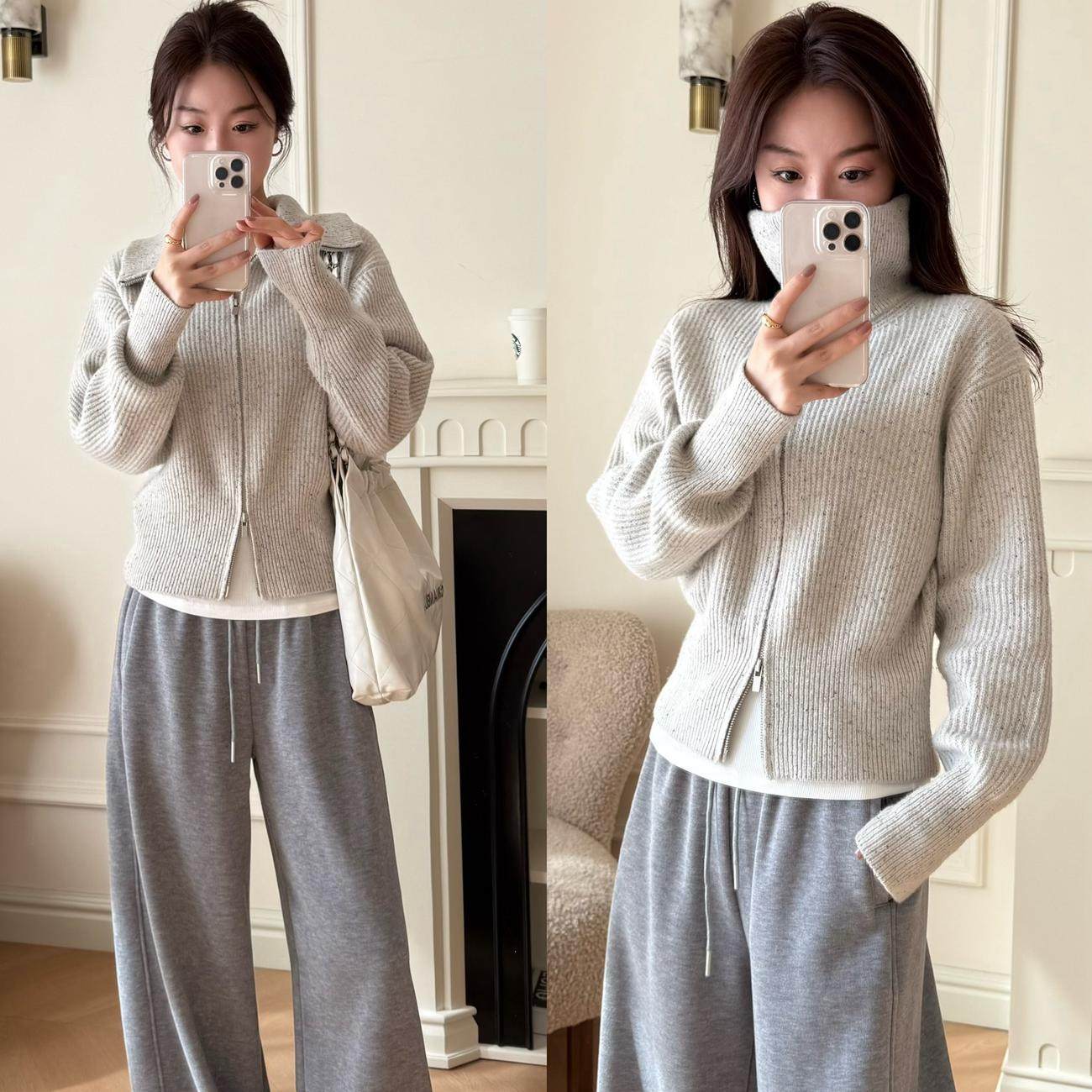 曹大曼 真丝羊毛双拉链休闲大翻领加厚毛衣显瘦针织开衫外套女