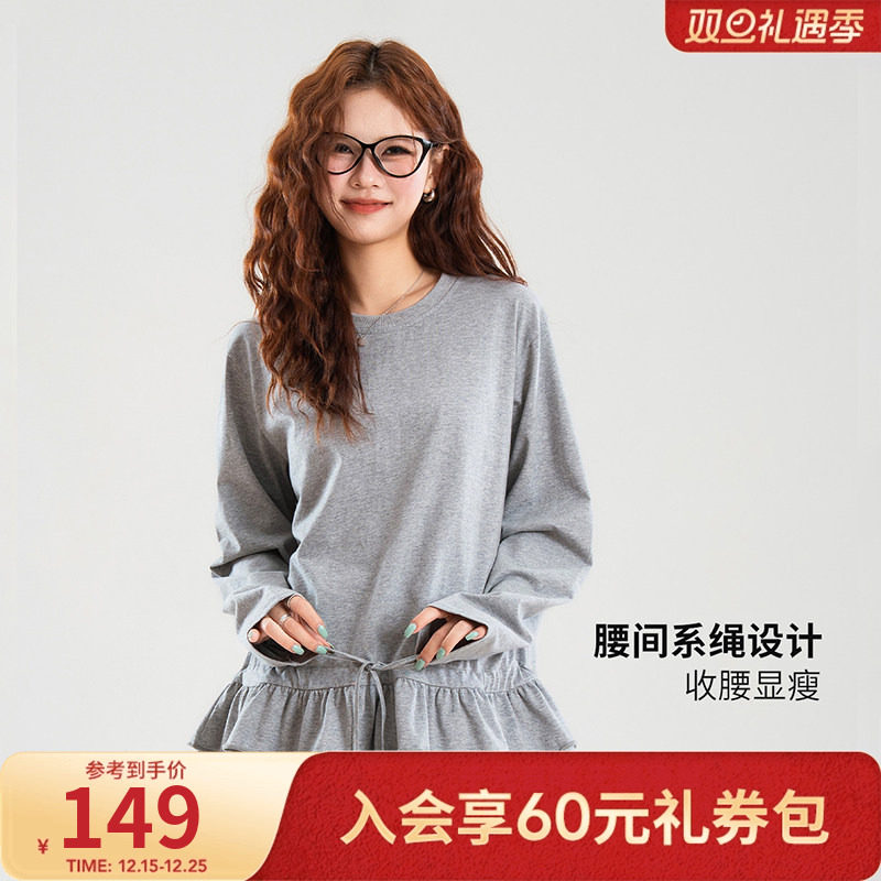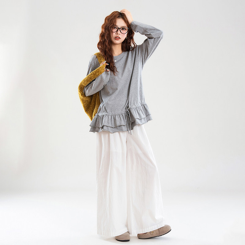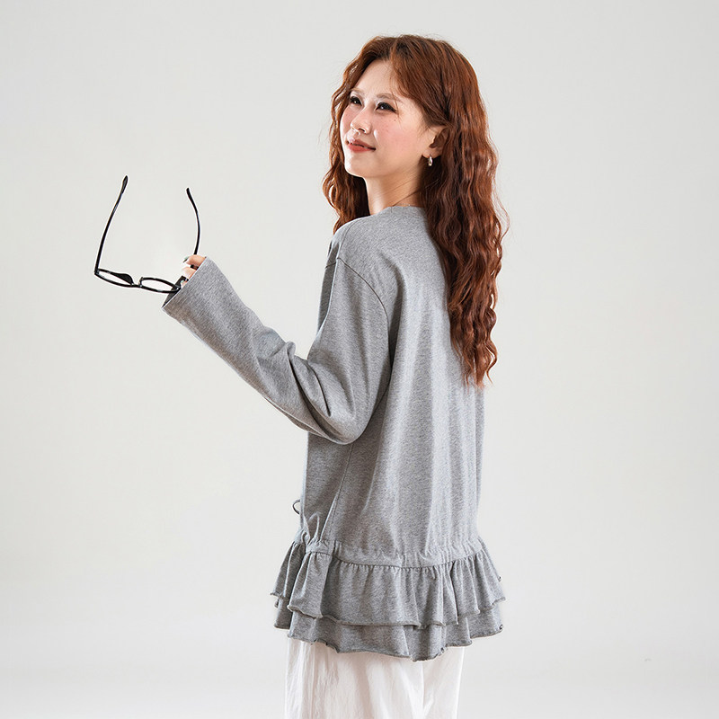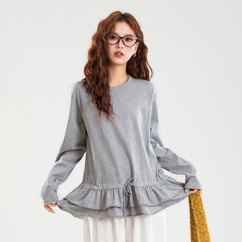 热风女士纯棉亲肤内搭韩系减龄荷叶边叠穿秋季时尚百搭长袖T恤