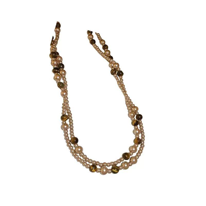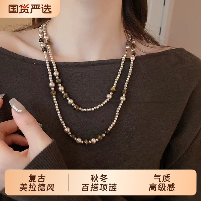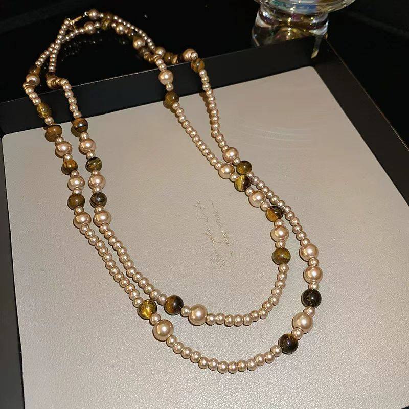 琥珀流光中古vintage双层虎眼色项链长款毛衣颈链配饰女高级感