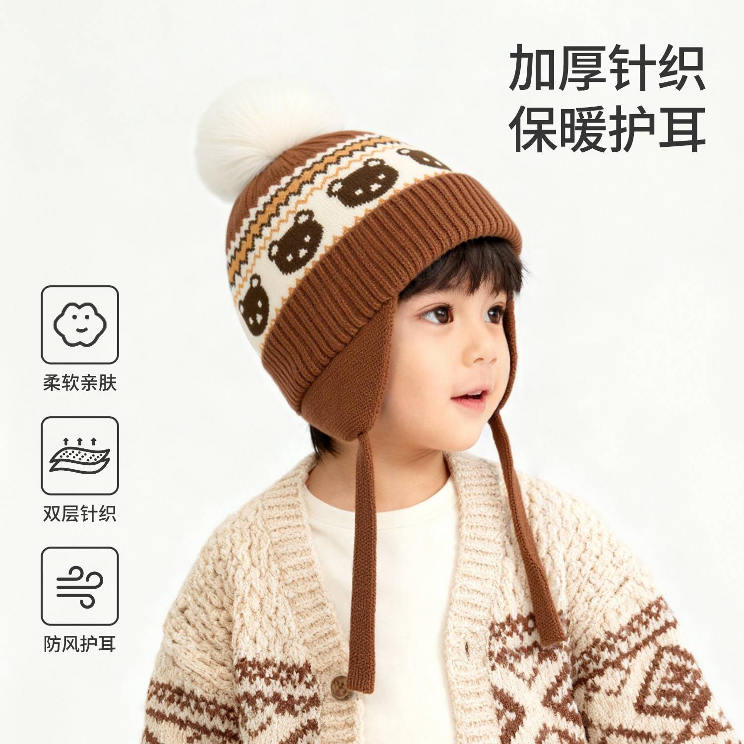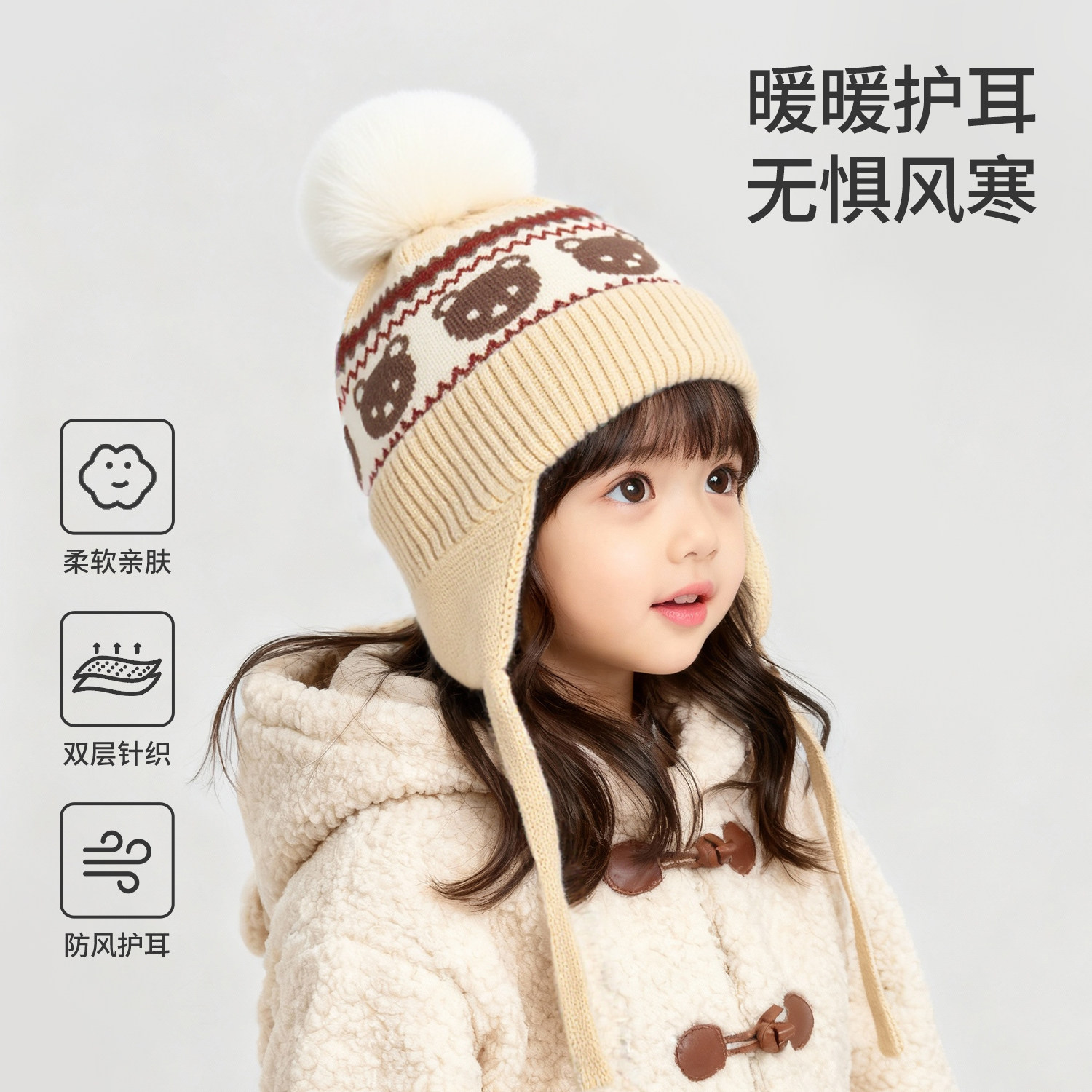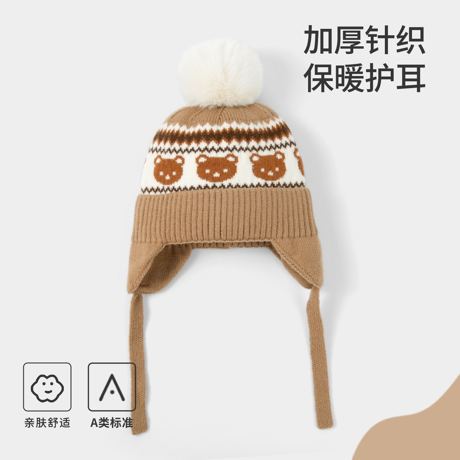 hugz儿童帽子男孩女孩保暖针织毛线帽秋冬季户外护耳防风熊仔帽子