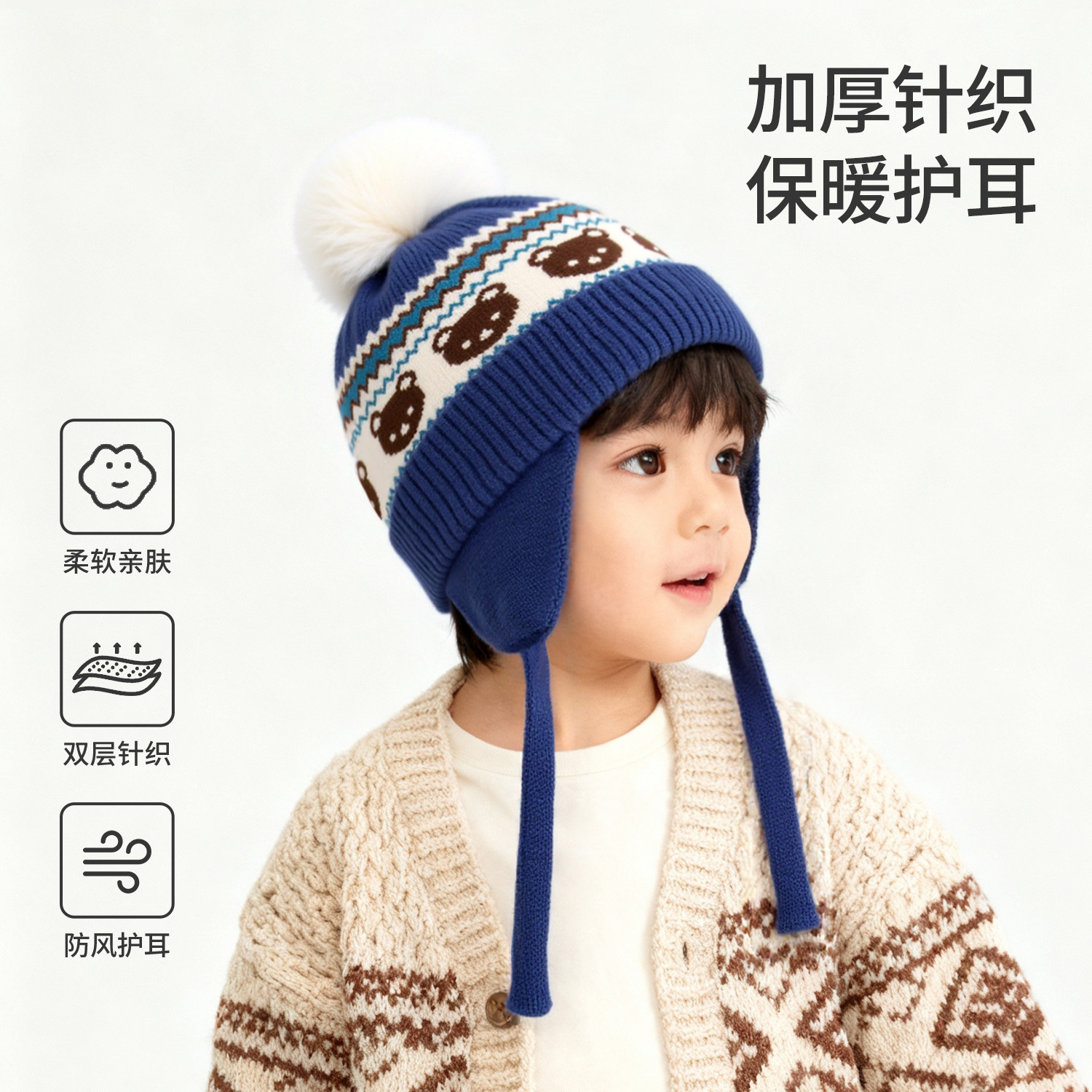 宝宝帽子秋冬儿童冬季防风护耳帽男童保暖针织毛线帽婴儿加厚冬天