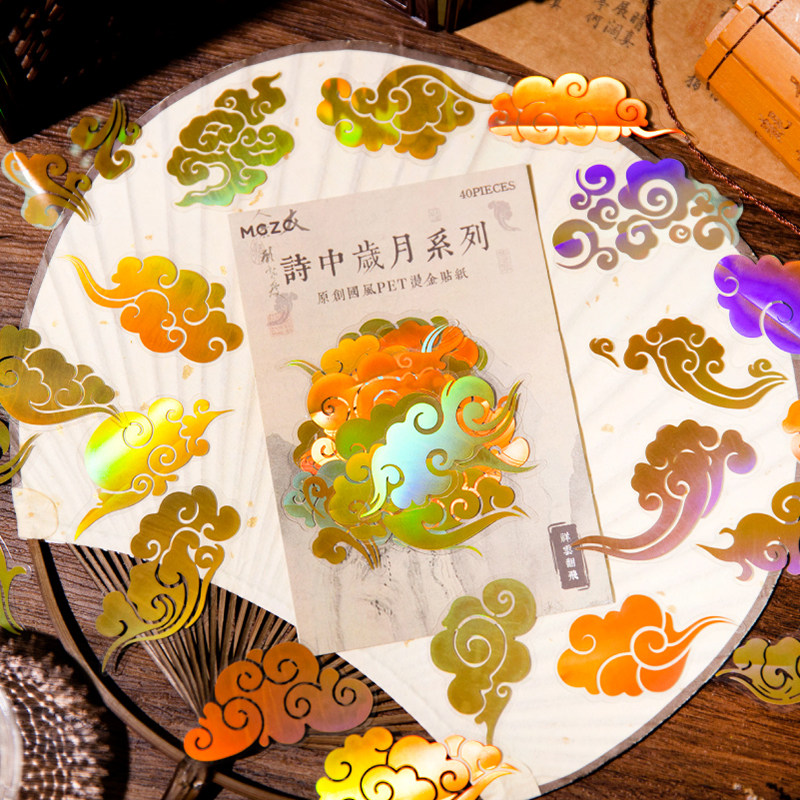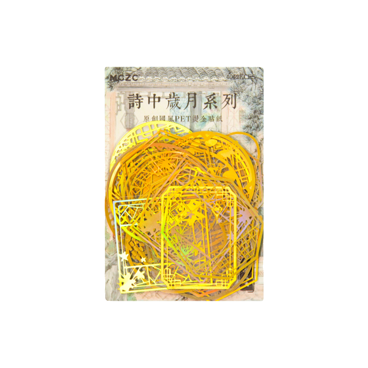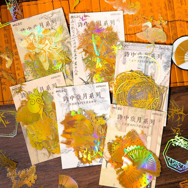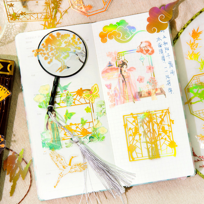 诗中岁月古典国风门窗扇子文艺烫金PET贴纸diy咕卡手帐拼贴素材贴