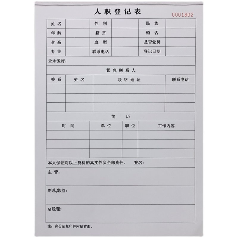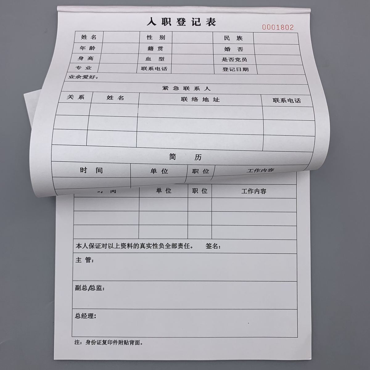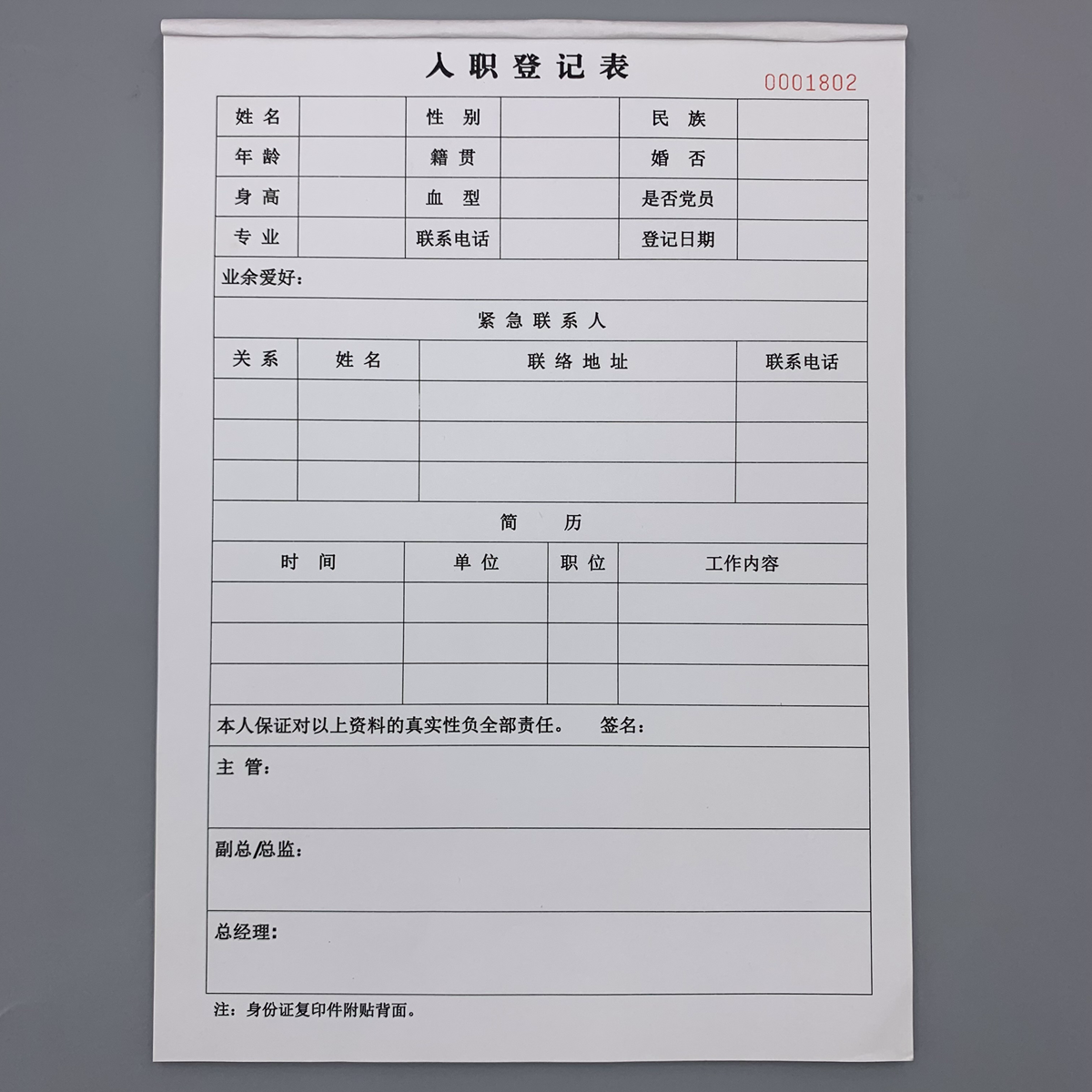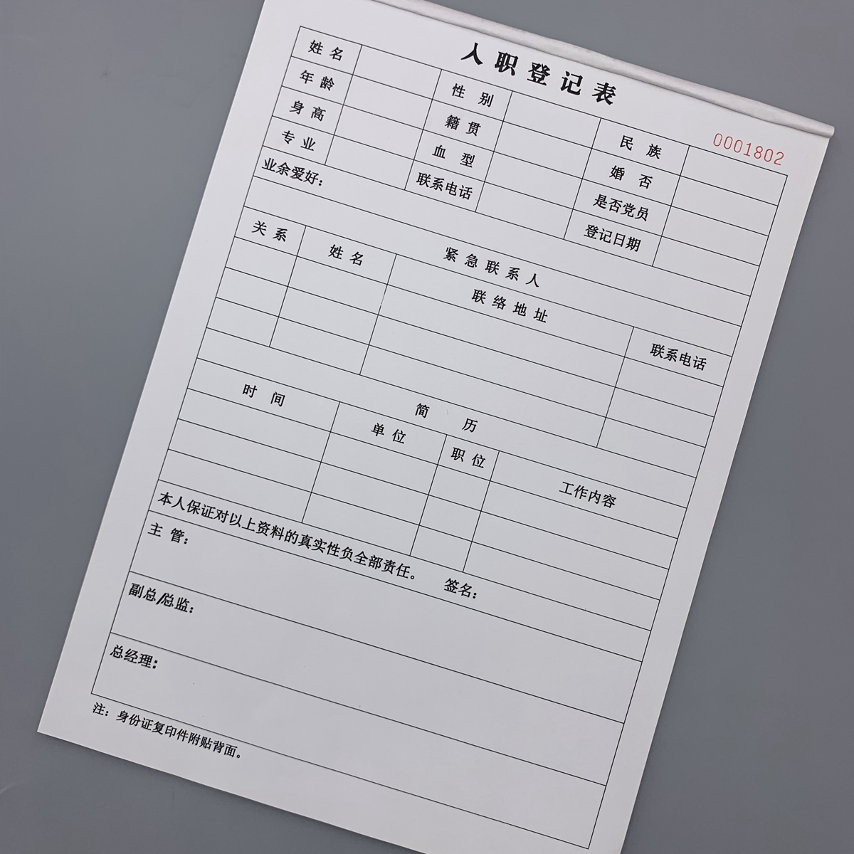 现货A4入职登记表申请单公司员工招聘登记本个人简历记录本可定制