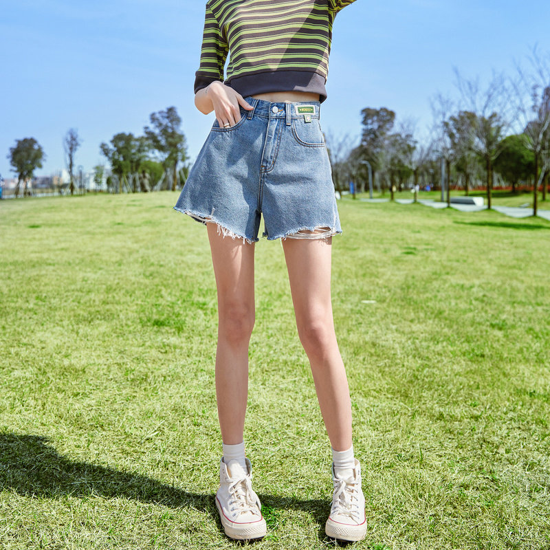 唐狮春夏季牛仔短裤女a字显瘦休闲高腰辣妹宽松破洞毛边小个子