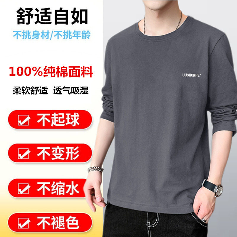 100%纯棉长袖t恤男春秋夏季薄款透气休闲运动百搭圆领上衣打底衫