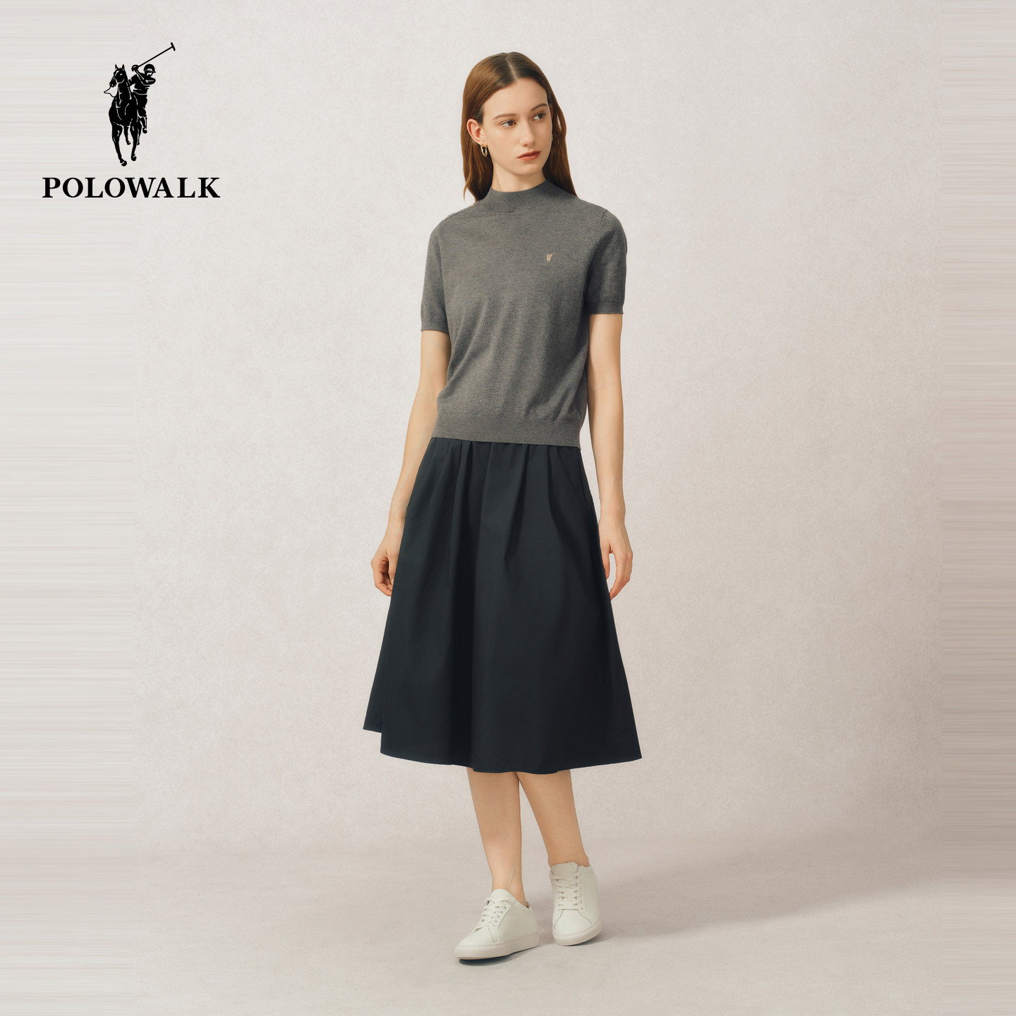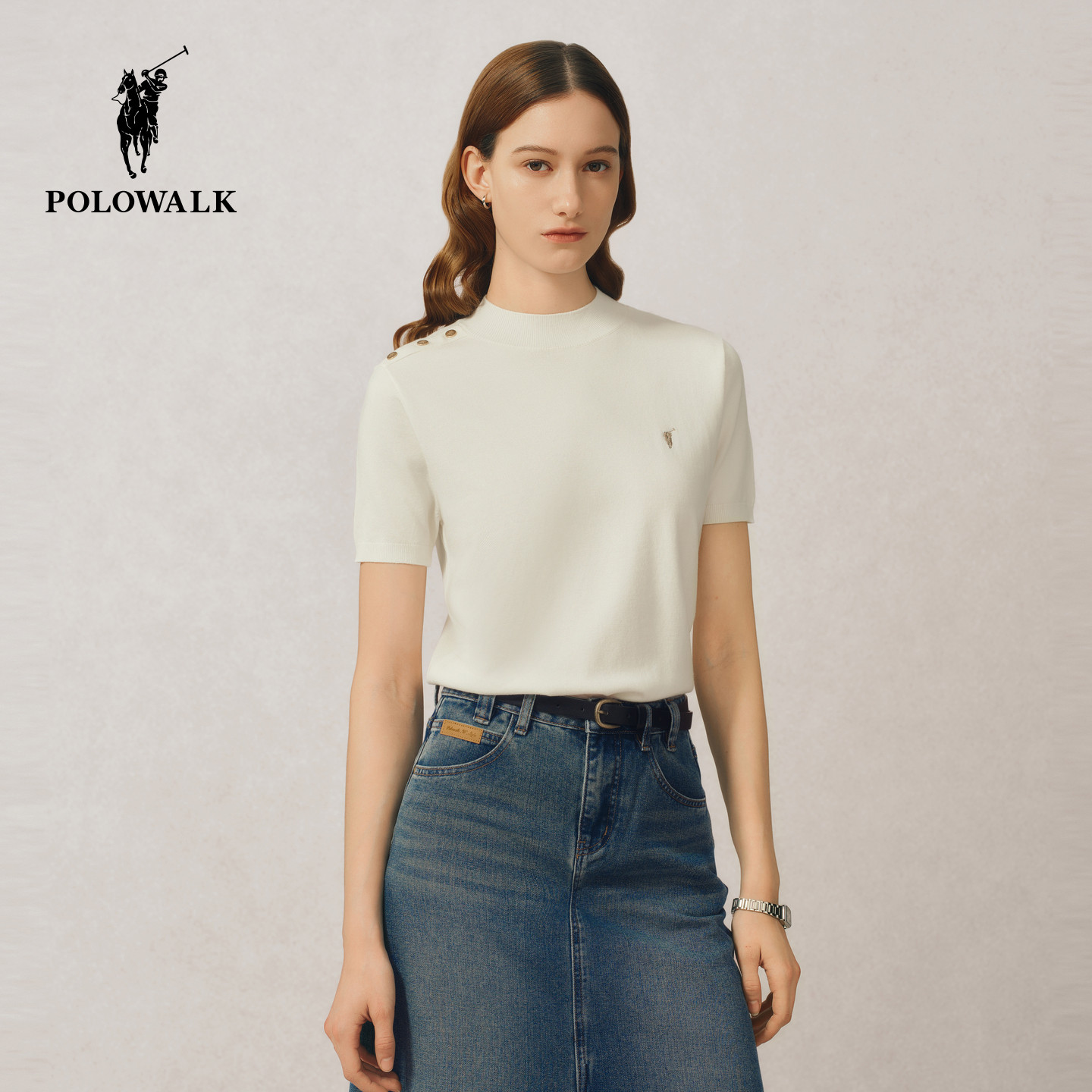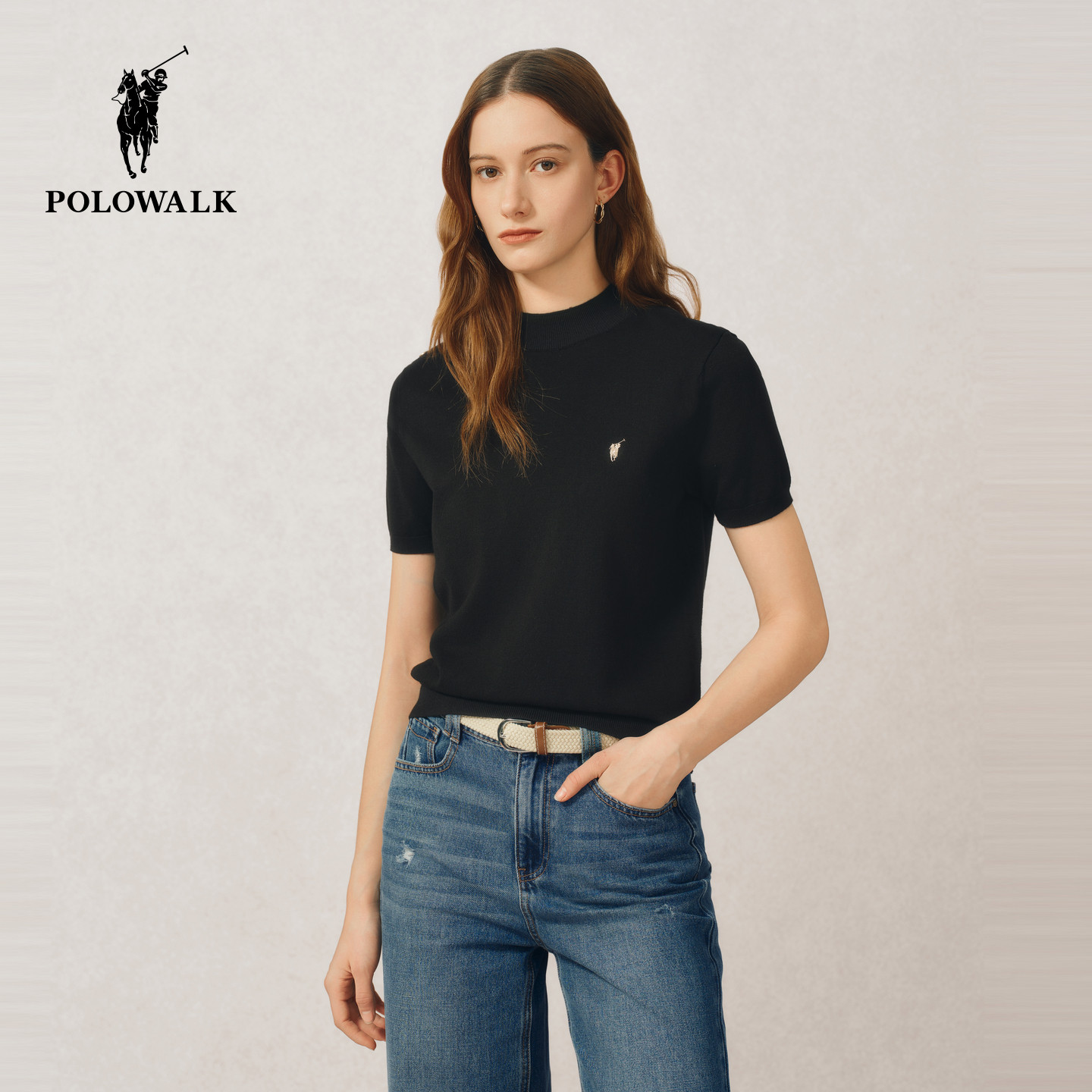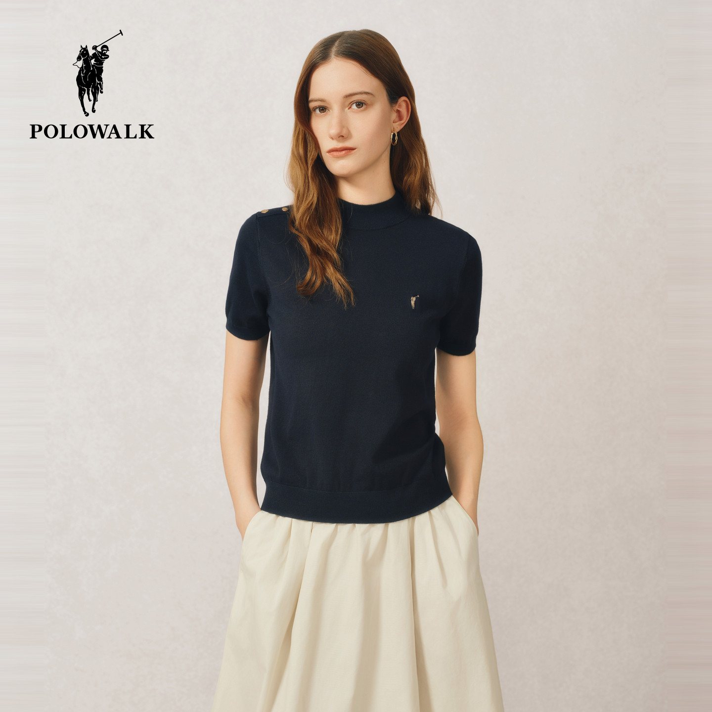 POLOWALK女士短袖针织衫2026夏装半高领针织T恤显瘦气质上衣