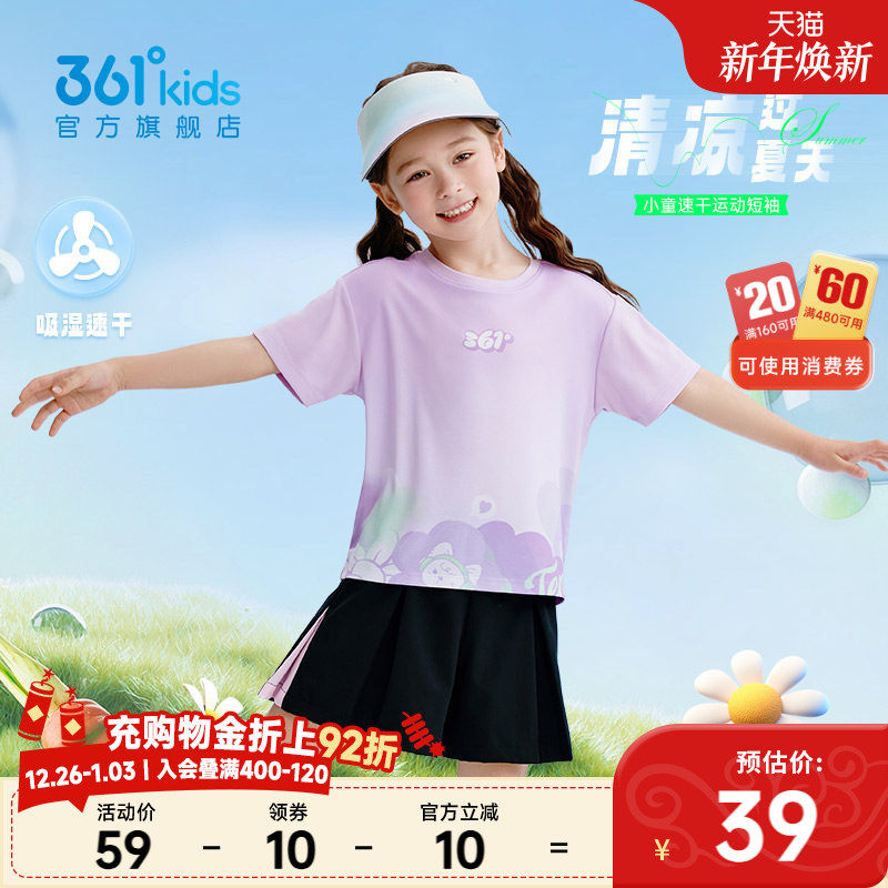 361°童装女童速干短袖T恤2025夏季新款儿童小童可爱休闲透气上衣
