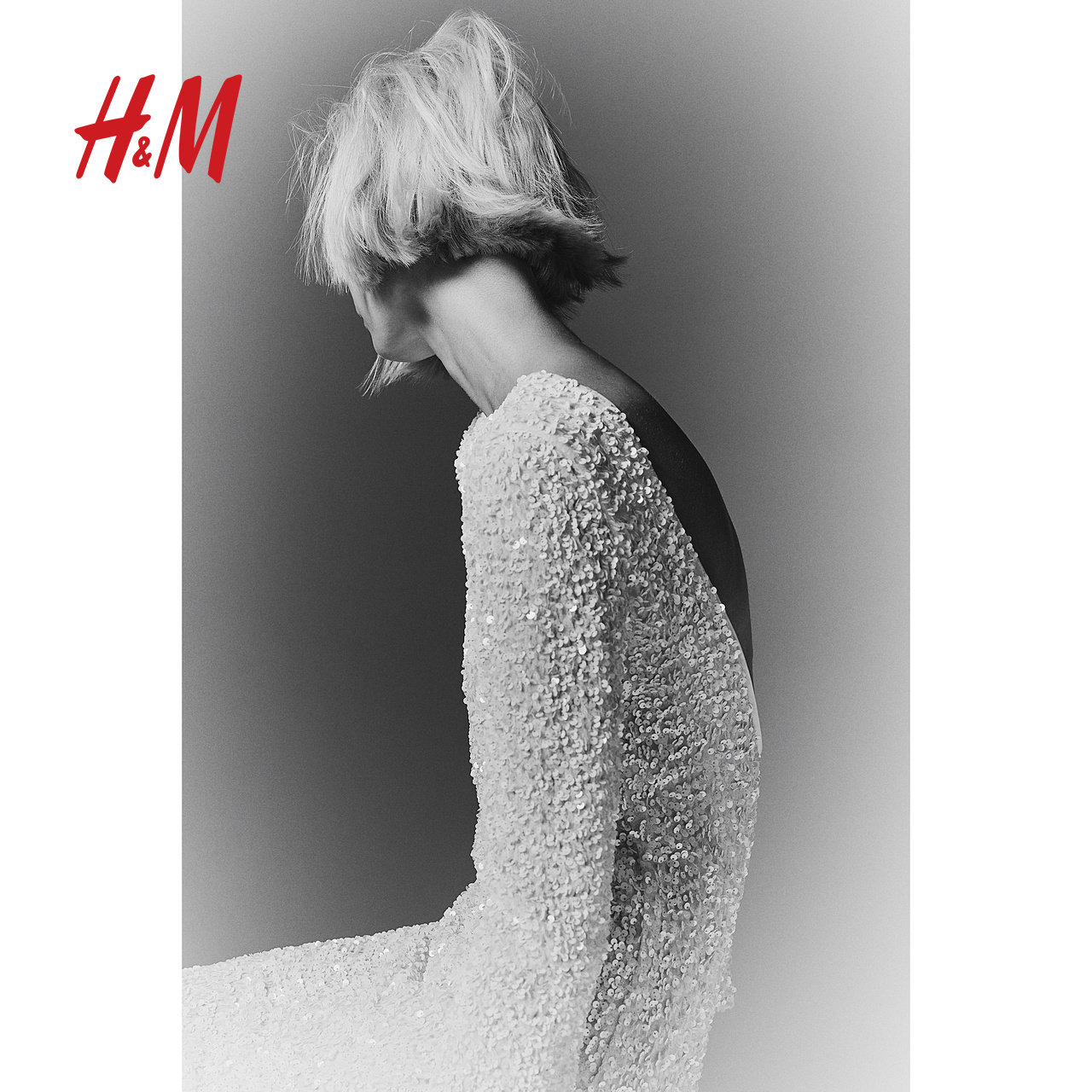 HM女装连衣裙冬季长袖亮片低露背一字领H版型短裙1245452