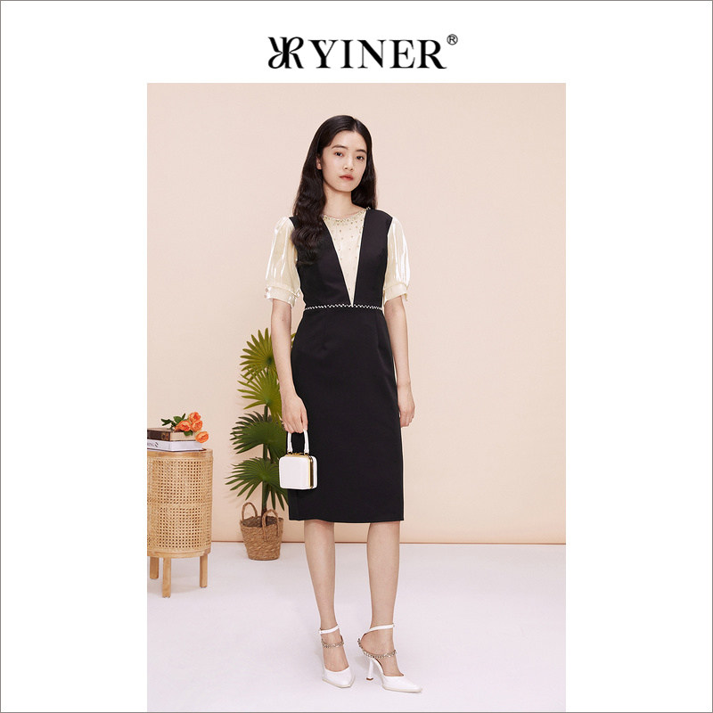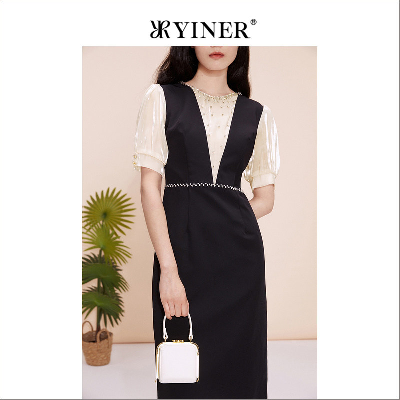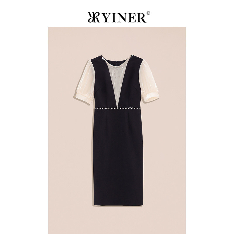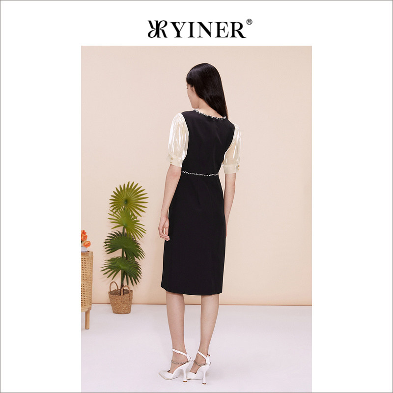 YINER音儿专选女装夏季法式钉钻圆领公主袖收腰连衣裙