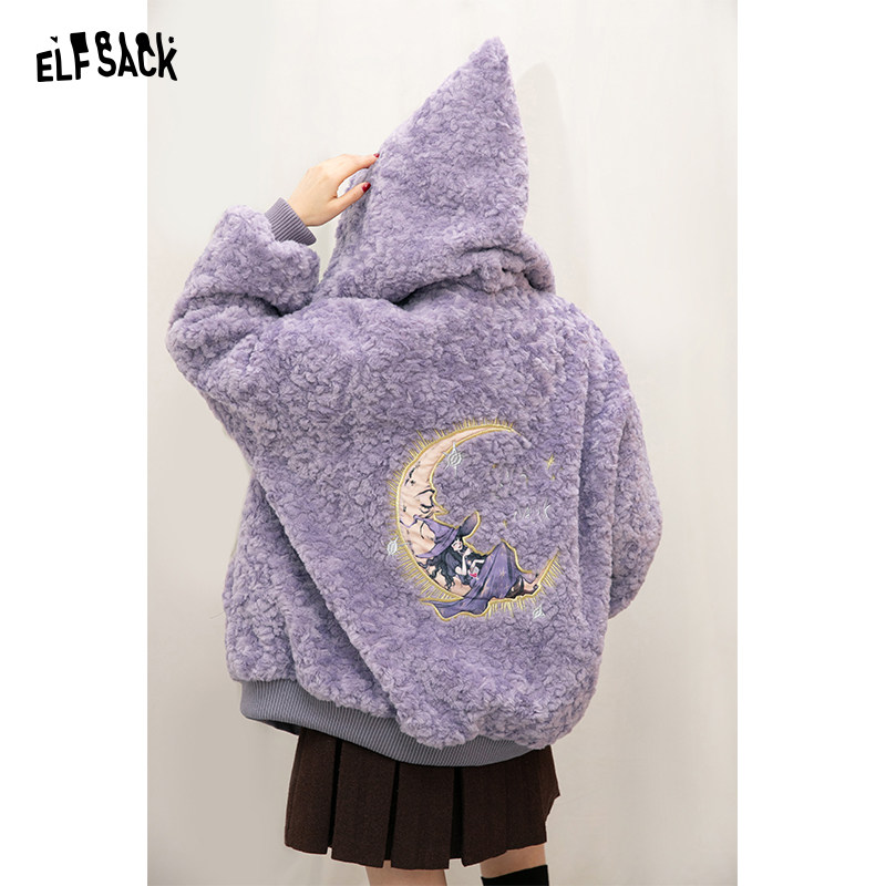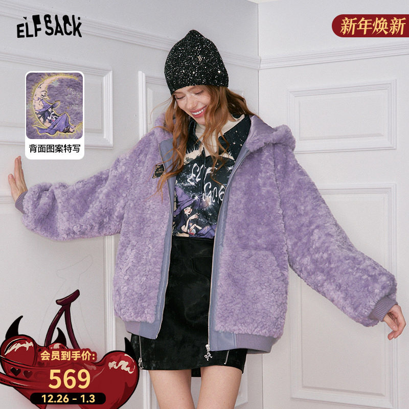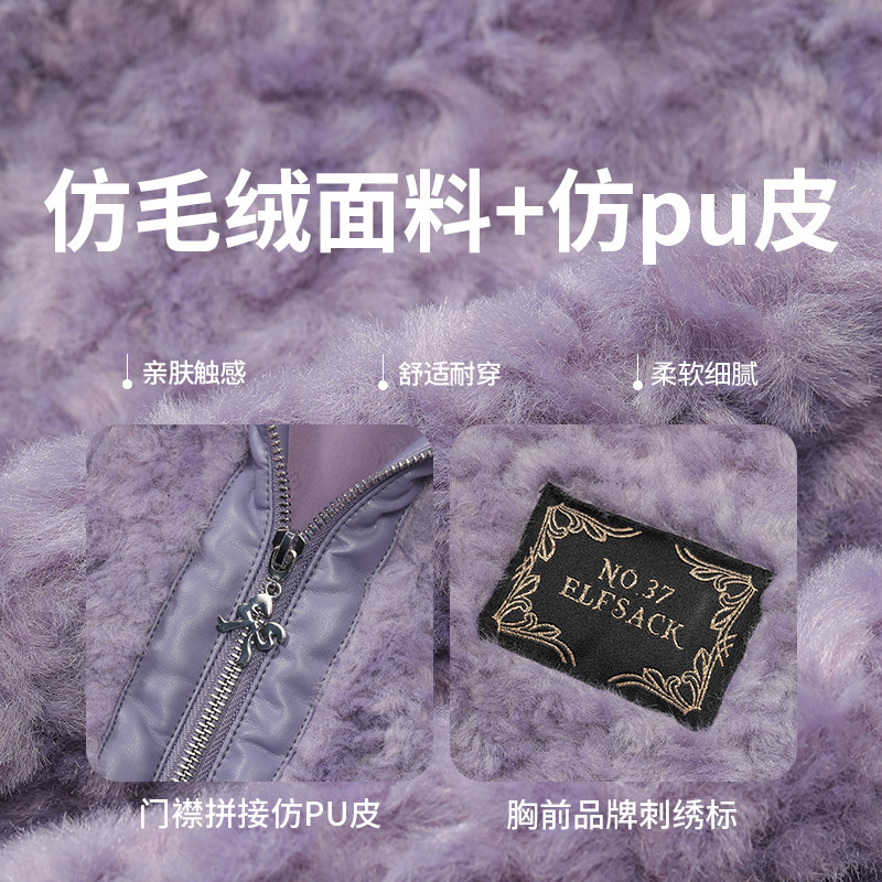 妖精的口袋紫色毛茸茸连帽毛呢外套女2025冬新款加厚保暖短款上衣