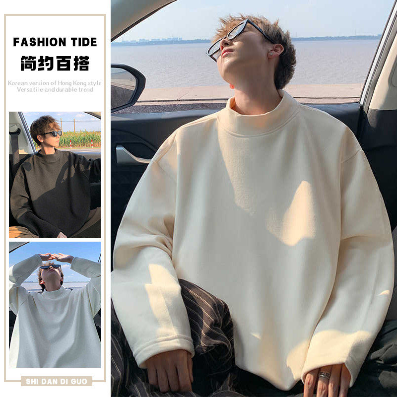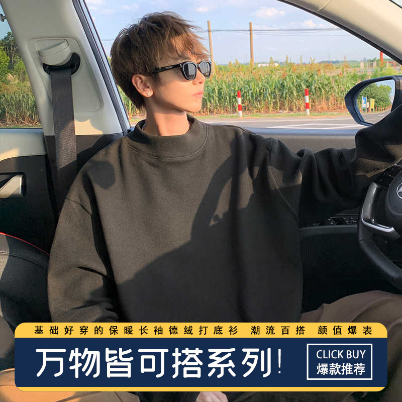 长袖t恤男2025新款秋冬季半高领德绒打底衫宽松黑色潮牌高端上衣