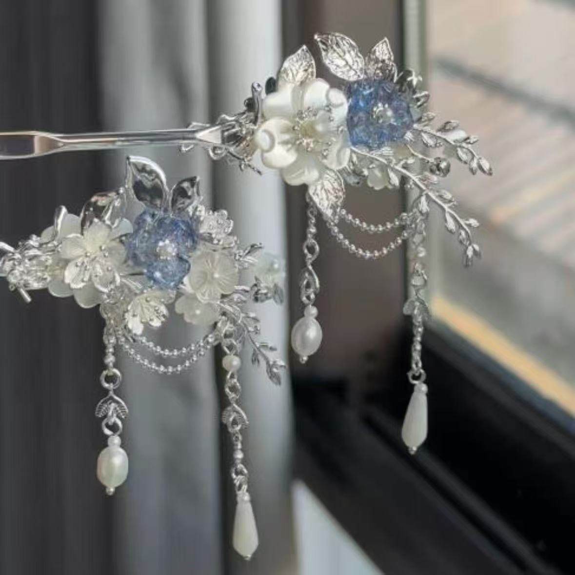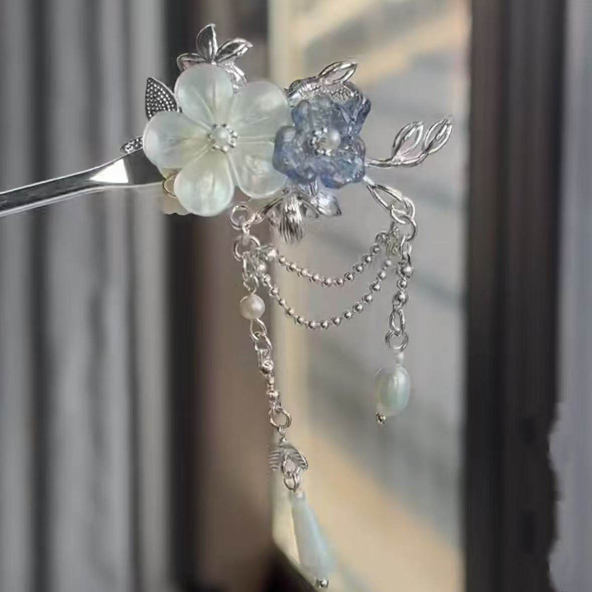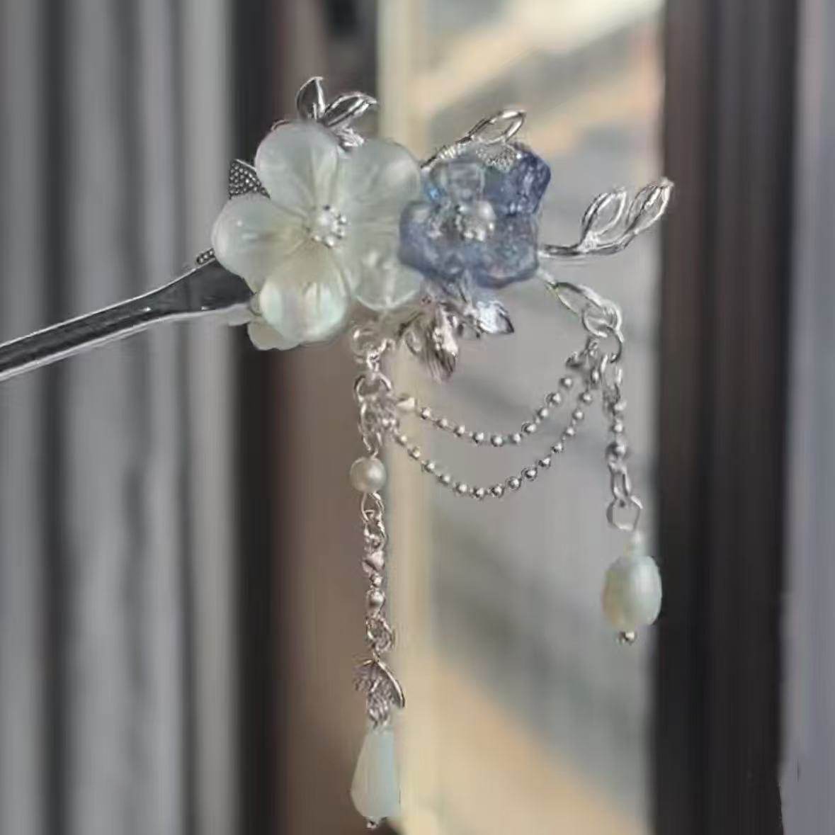 清冷仙韵!蓝白双色古风发簪新中式花朵撞色流苏发簪盘发汉服簪子