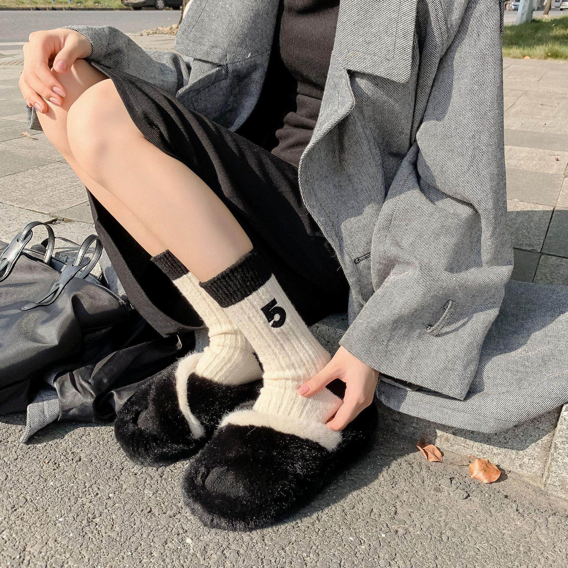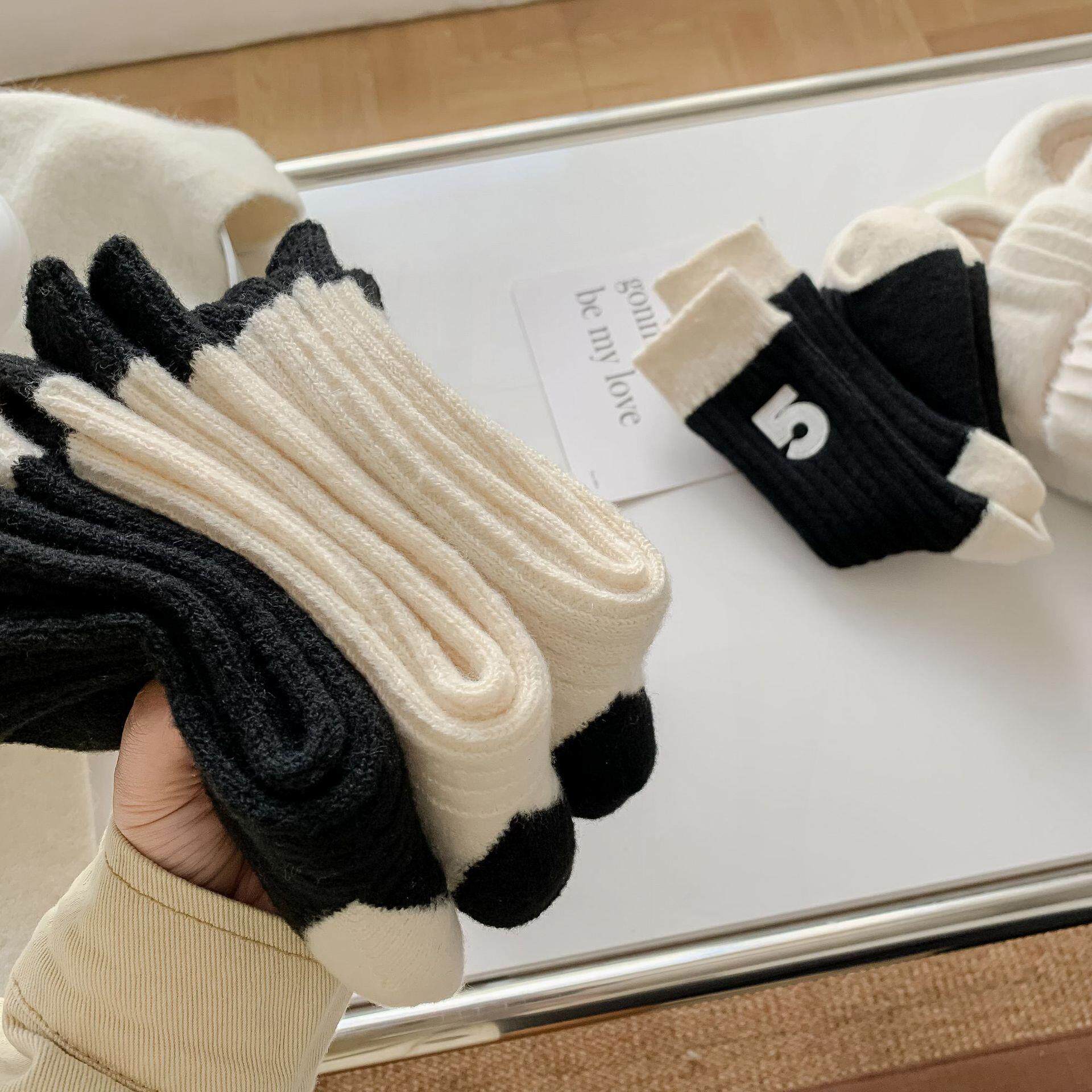 日本无印刺绣羊毛袜秋冬配鲨鱼裤的袜子纯色中筒袜女袜堆堆袜新款