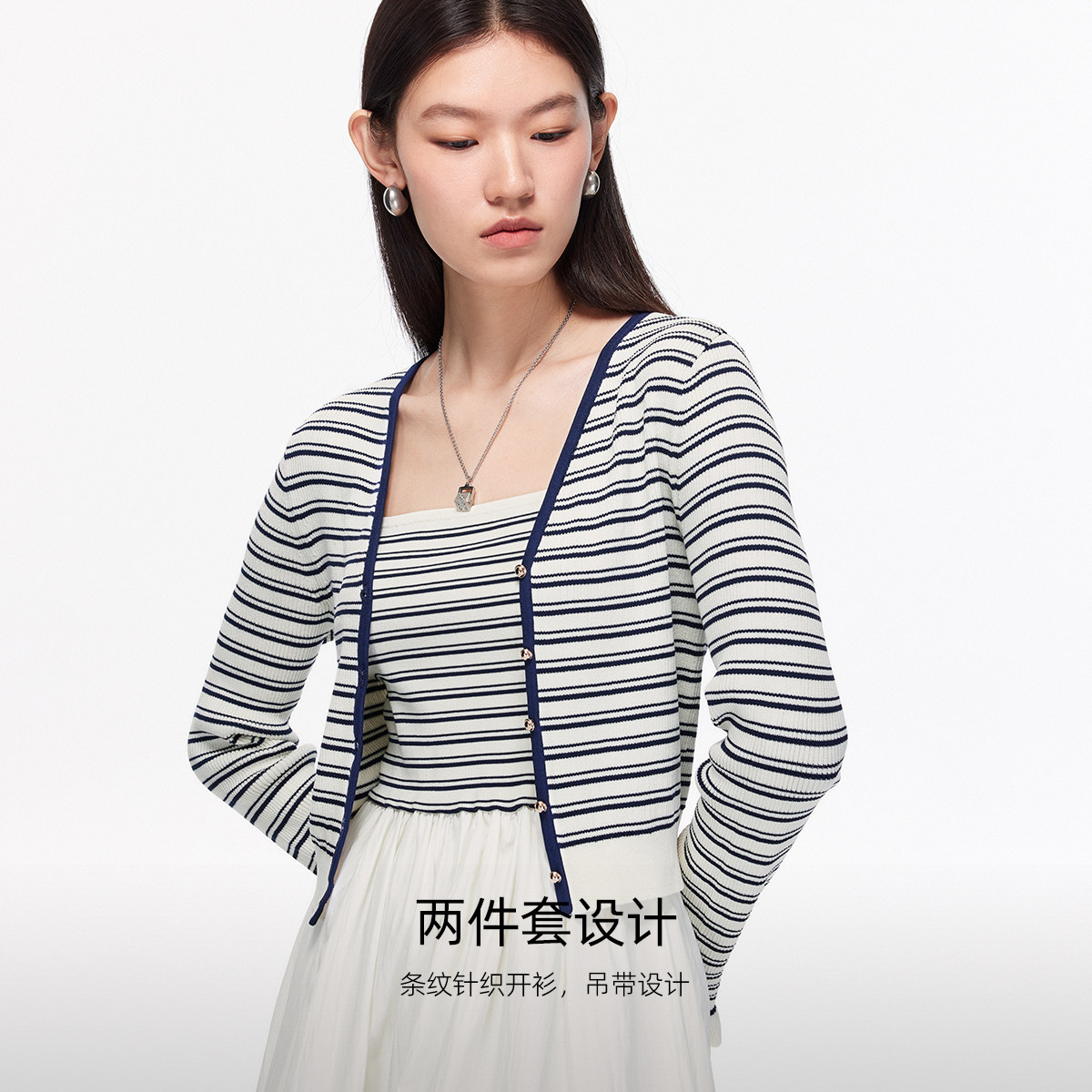 两件套设计 轻松搞定搭配;条纹针织开衫