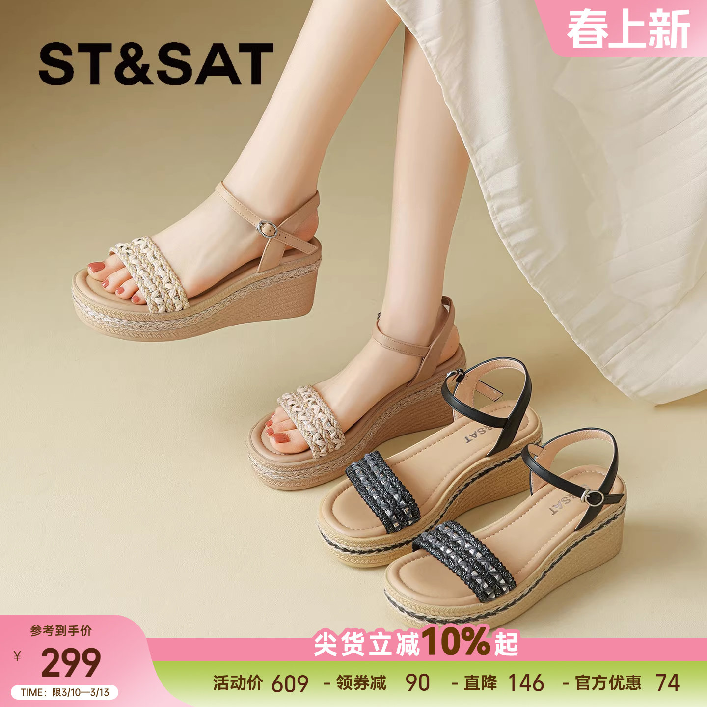 星期六编织坡跟时装凉鞋女2026夏季新款厚底露趾增高舒适松糕鞋子