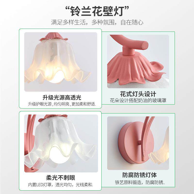 床头壁灯法式复古田园花朵背景墙灯奶油风少女ins卧室房间led灯具
