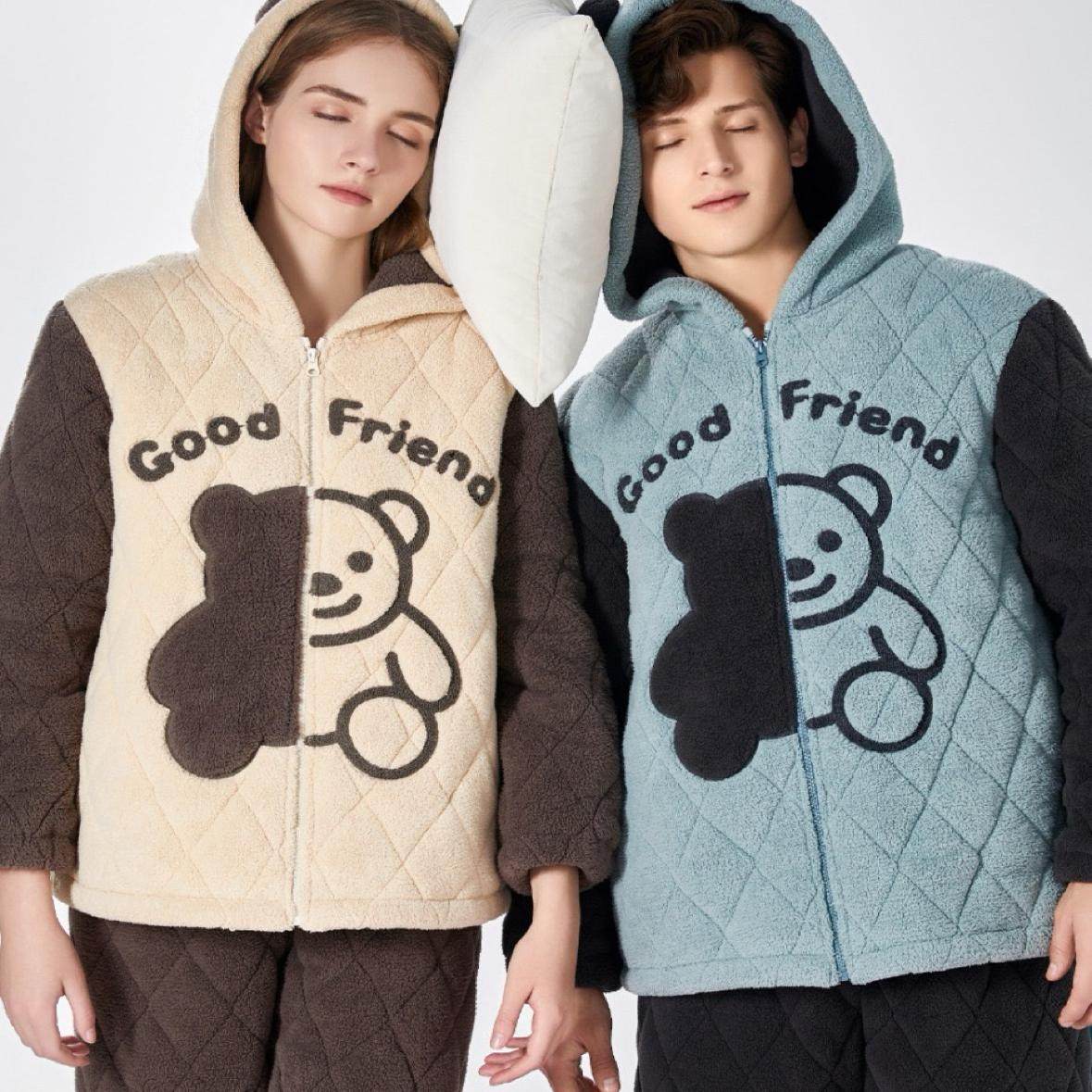 冬季珊瑚绒男士睡衣三层夹棉加厚加绒法兰绒秋冬款家居服保暖套装