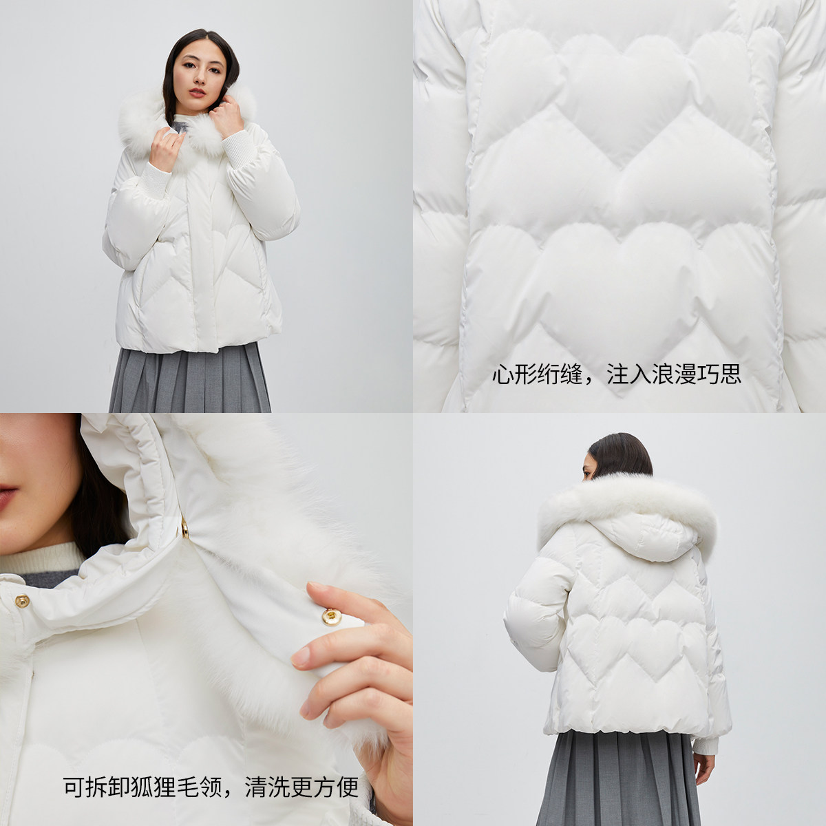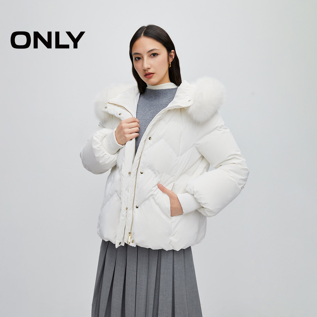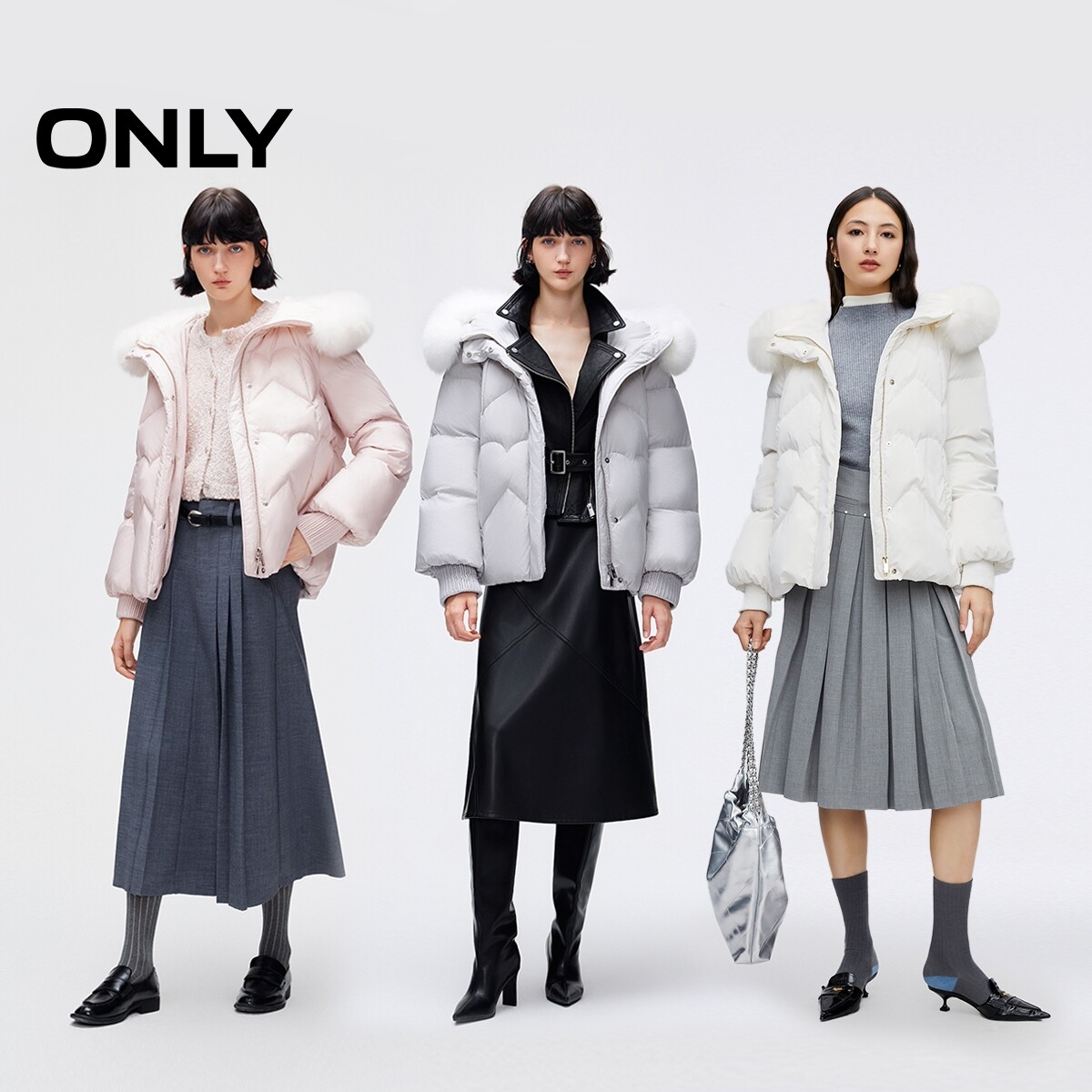 ONLY2025冬季新款甜美心形绗缝狐狸毛领实用口袋连帽羽绒服女