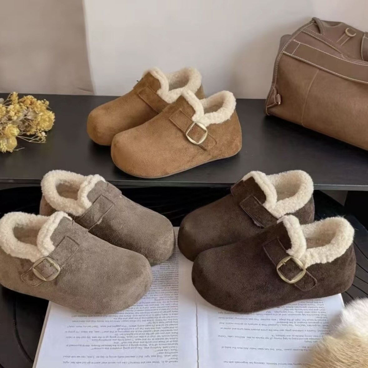 叁叔家~内增高勃肯鞋女加绒秋冬保暖毛毛半拖外穿厚底博肯鞋