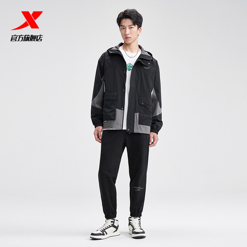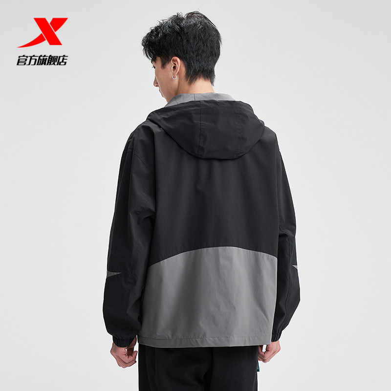 特步防泼水夹克外套男春秋季户外风衣连帽黑色上衣防风运动训练服