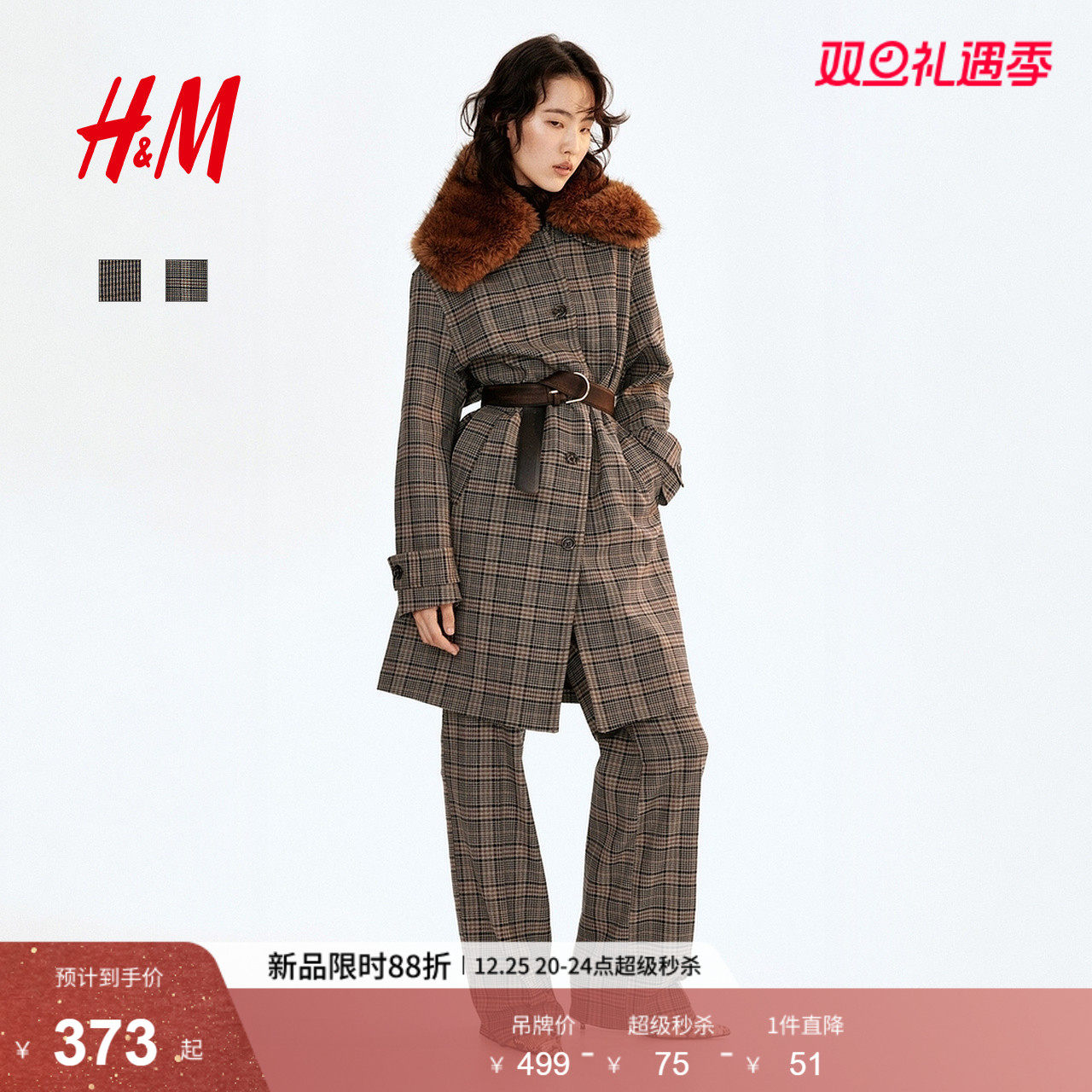 HM女装毛呢外套2025冬季新款气质上衣单排扣格子长款大衣1298554