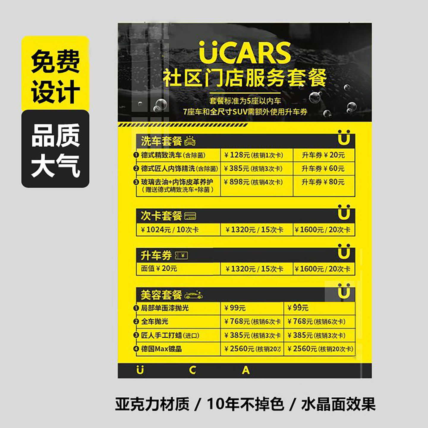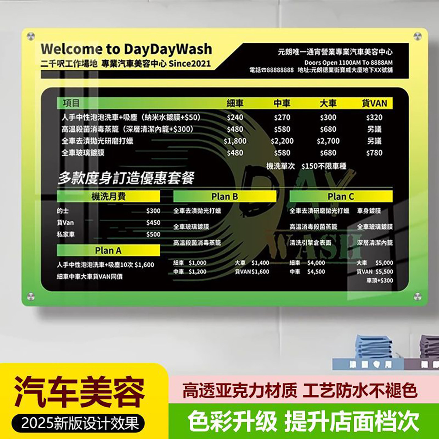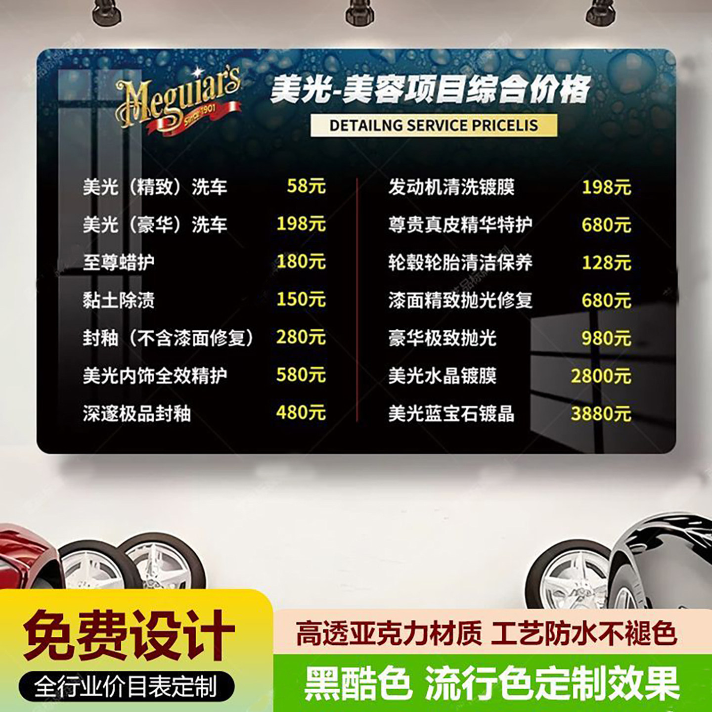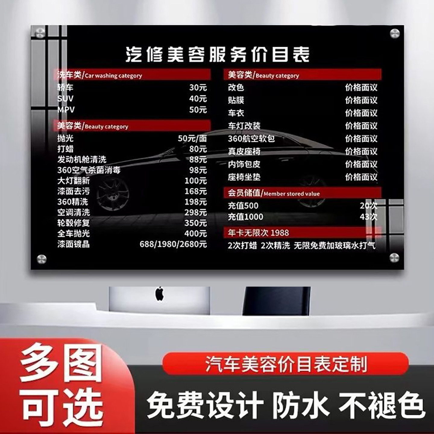 汽车美容院价目表定制补胎保养项目微维修洗车店价格表亚克力挂墙