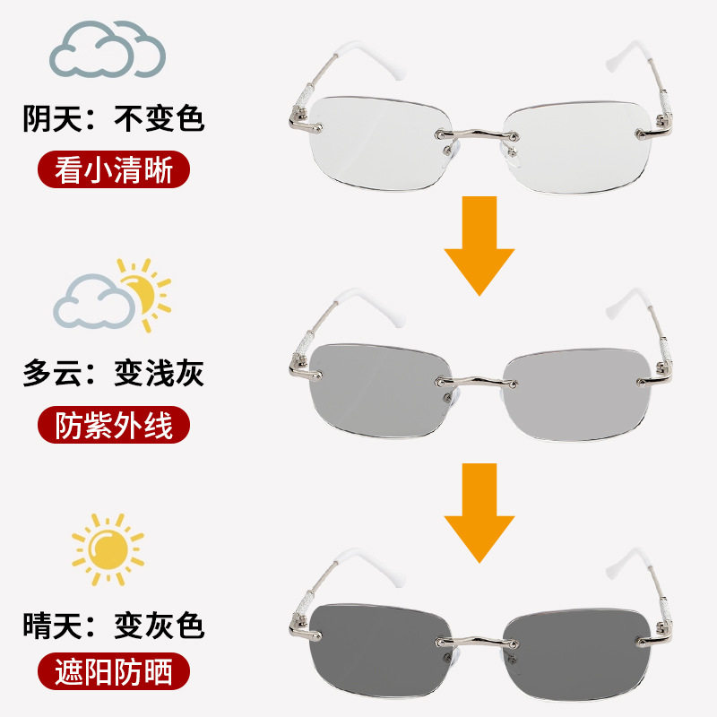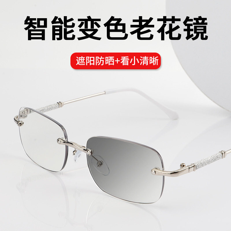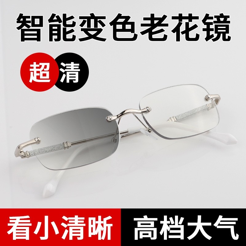 智能变色老花镜高清新款无框银白色老花眼镜男女款防蓝光超轻时尚