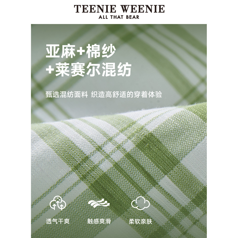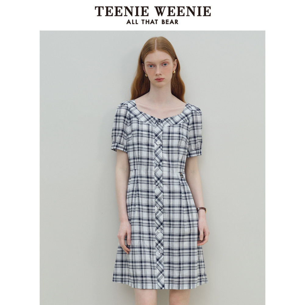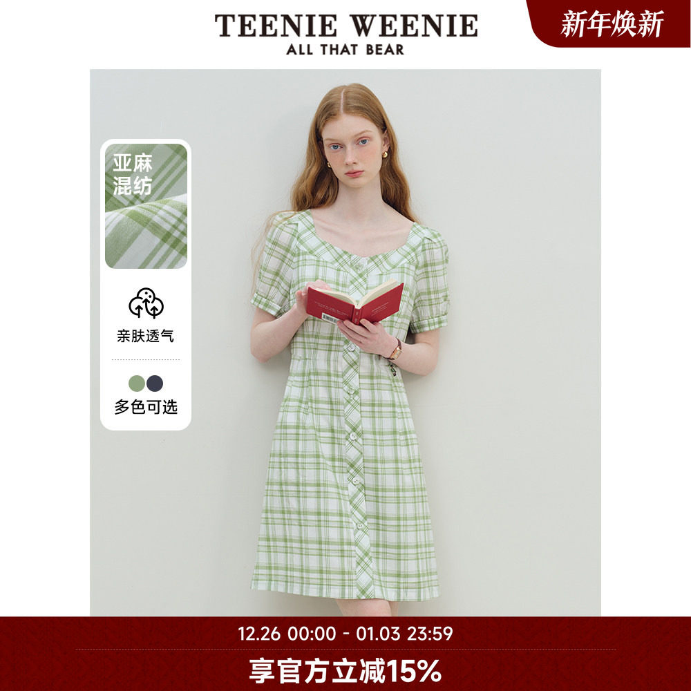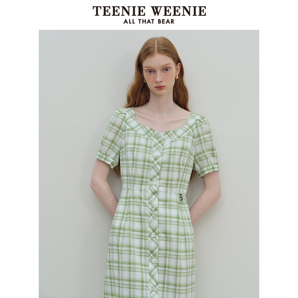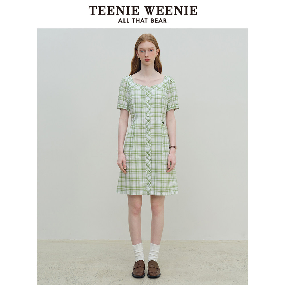 TeenieWeenie小熊奥莱女装清新气质方领连衣裙夏装绿格纹收腰裙子