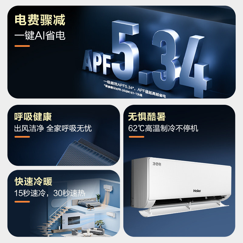 【镇店爆款】海尔空调净省电Plus1.5匹1匹家用官方新一级挂机35E1