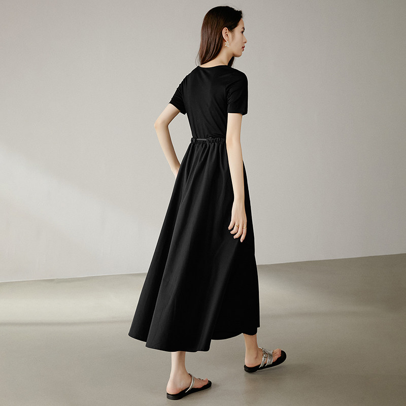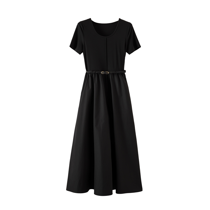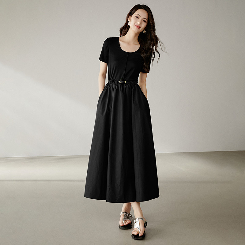 晚白2026年春新款时尚简约圆领小黑裙高腰显瘦拼接大摆连衣裙