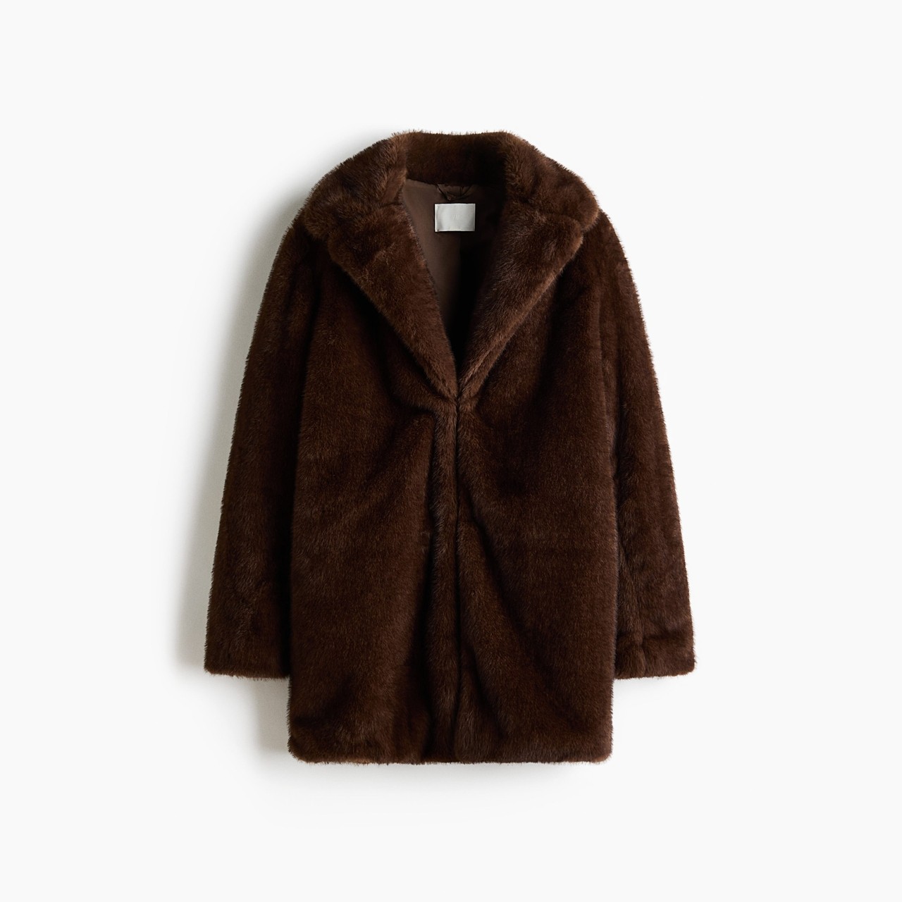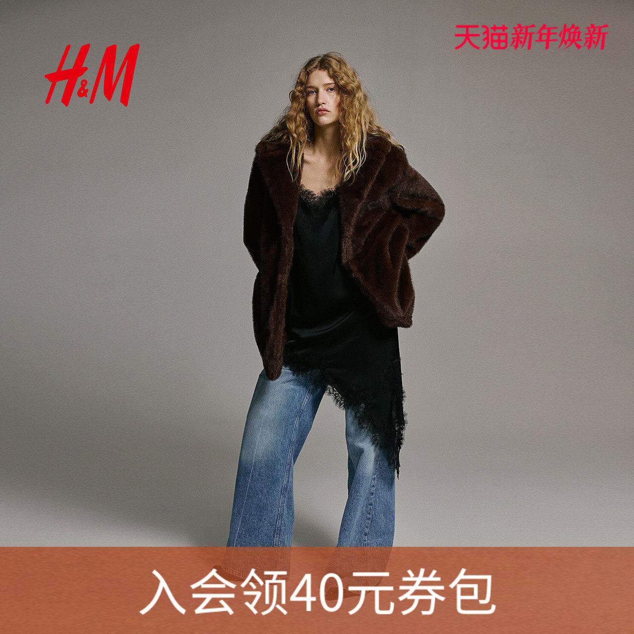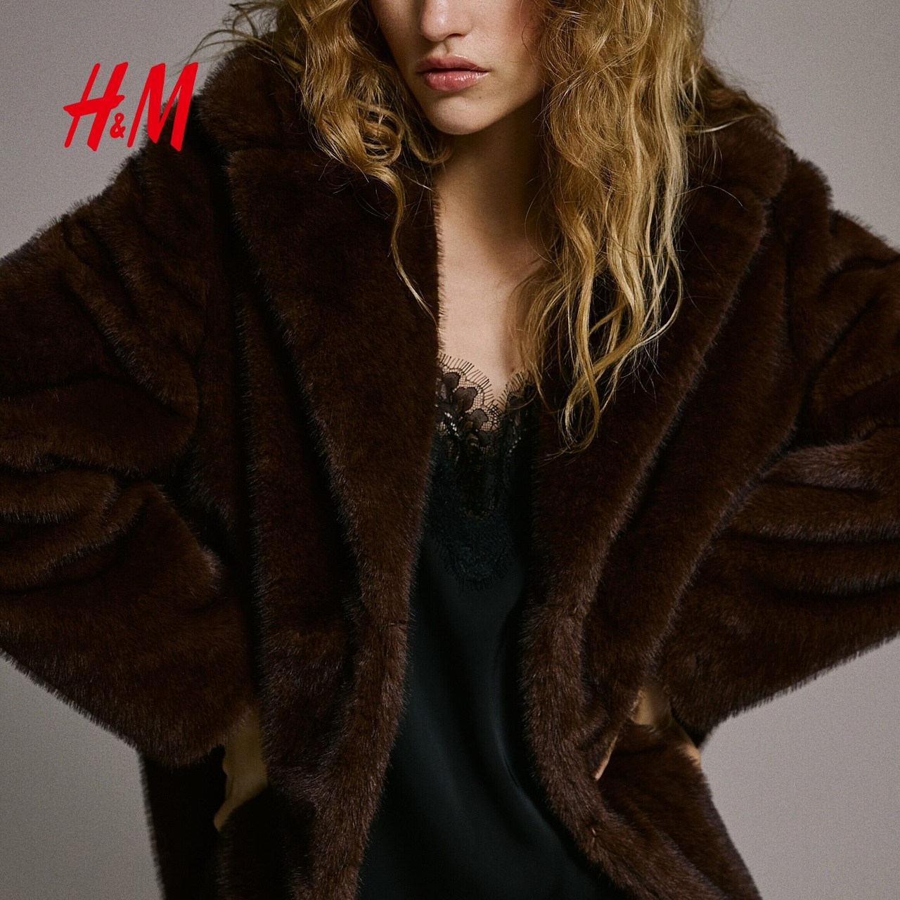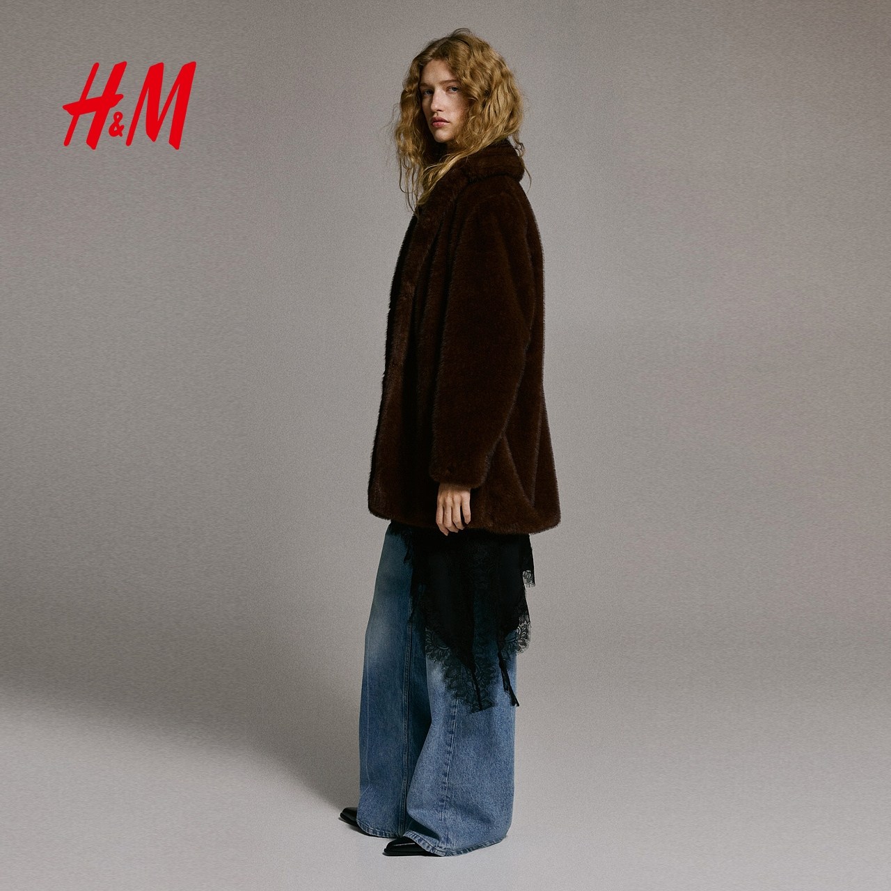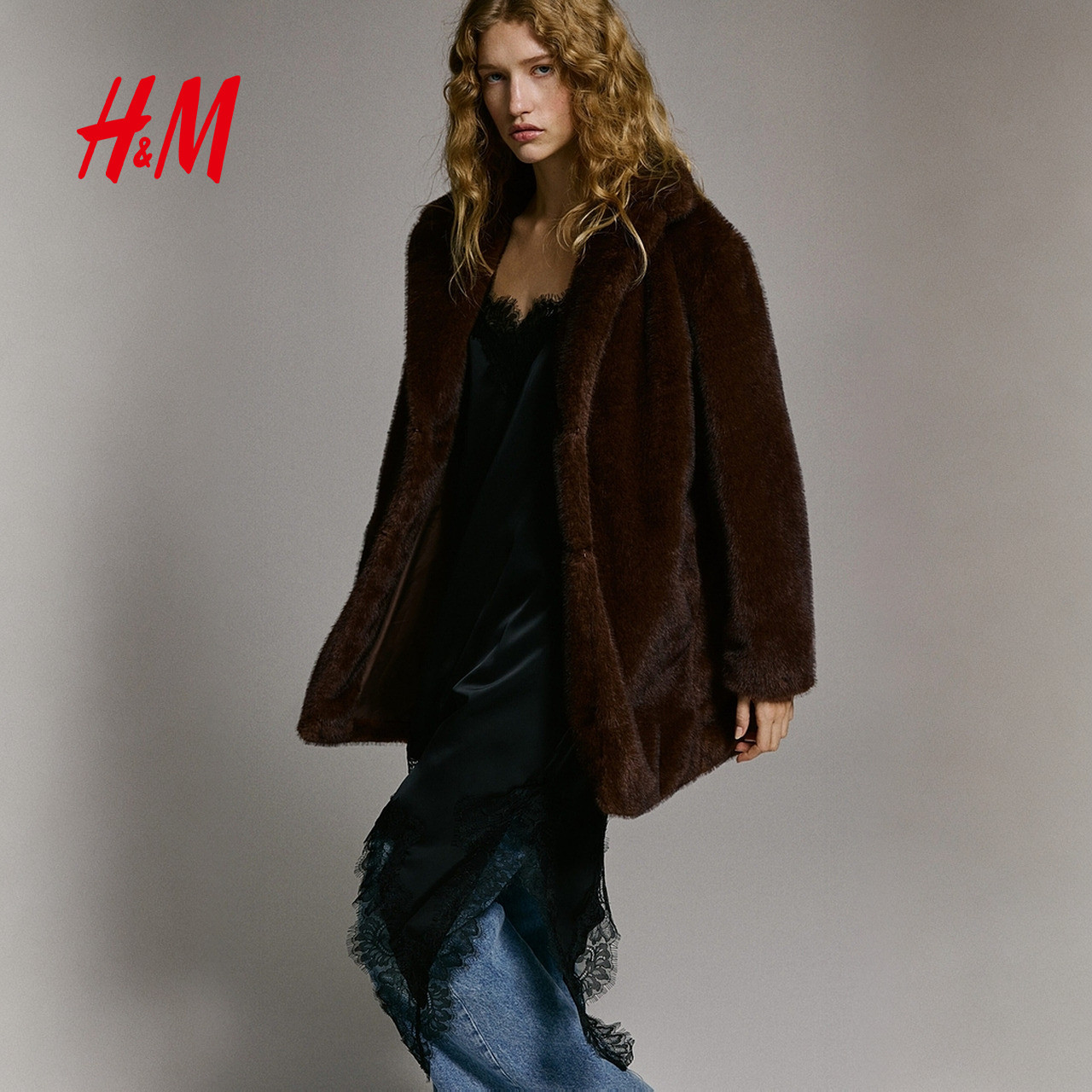 HM女装外套2025冬季新款保暖仿皮草毛茸宽平驳领大衣1306290