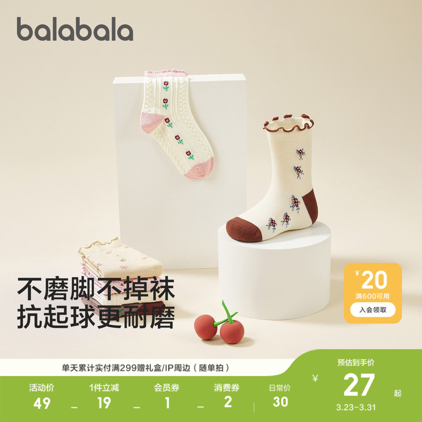 巴拉巴拉女童袜子春秋装儿童中筒袜子学生袜不勒脚提花三双装