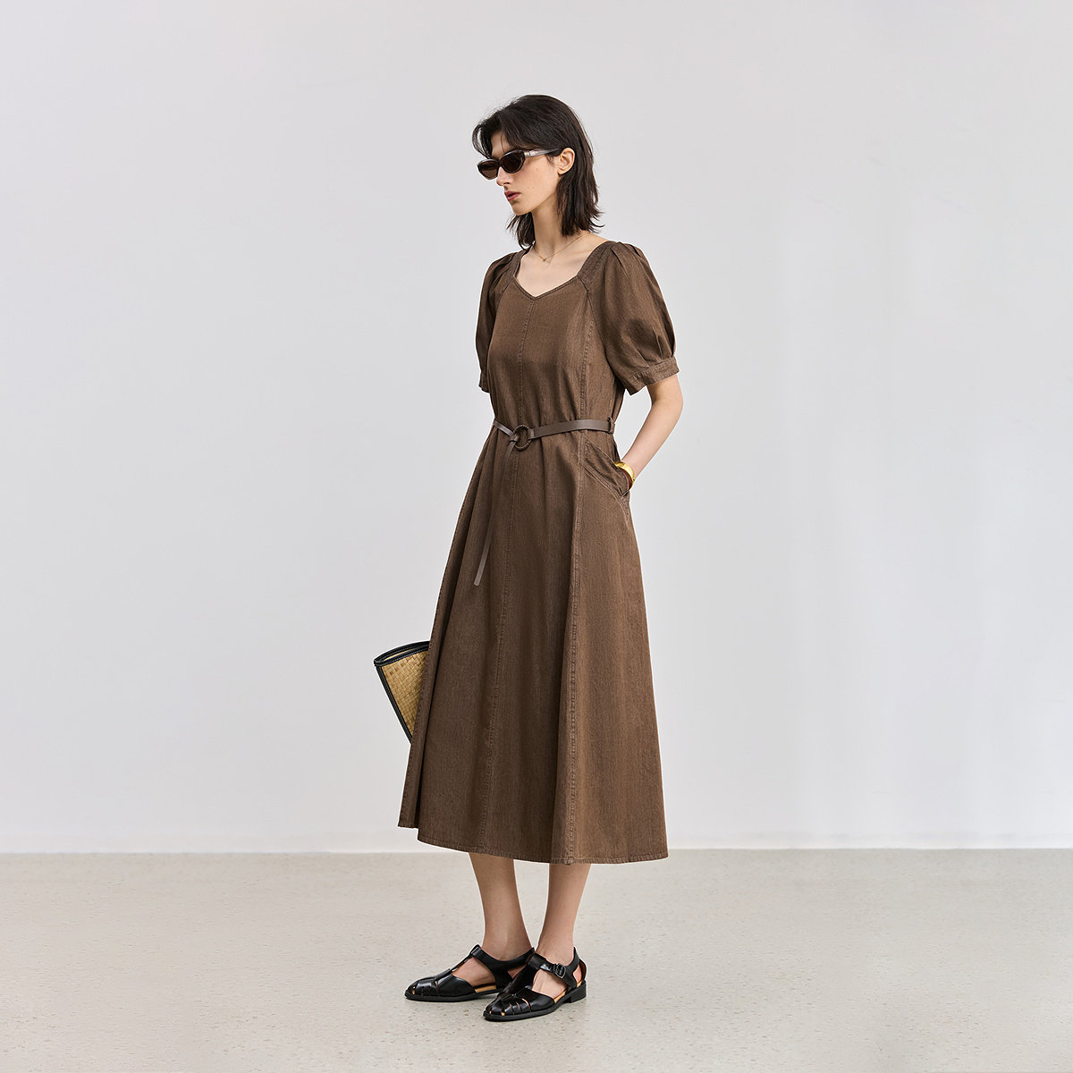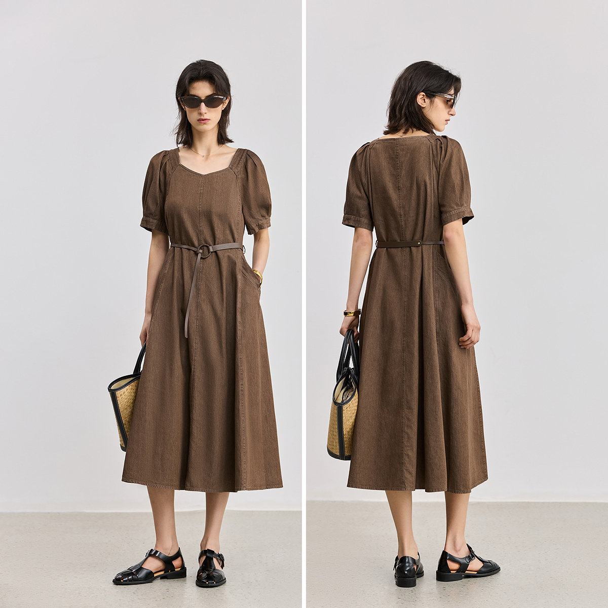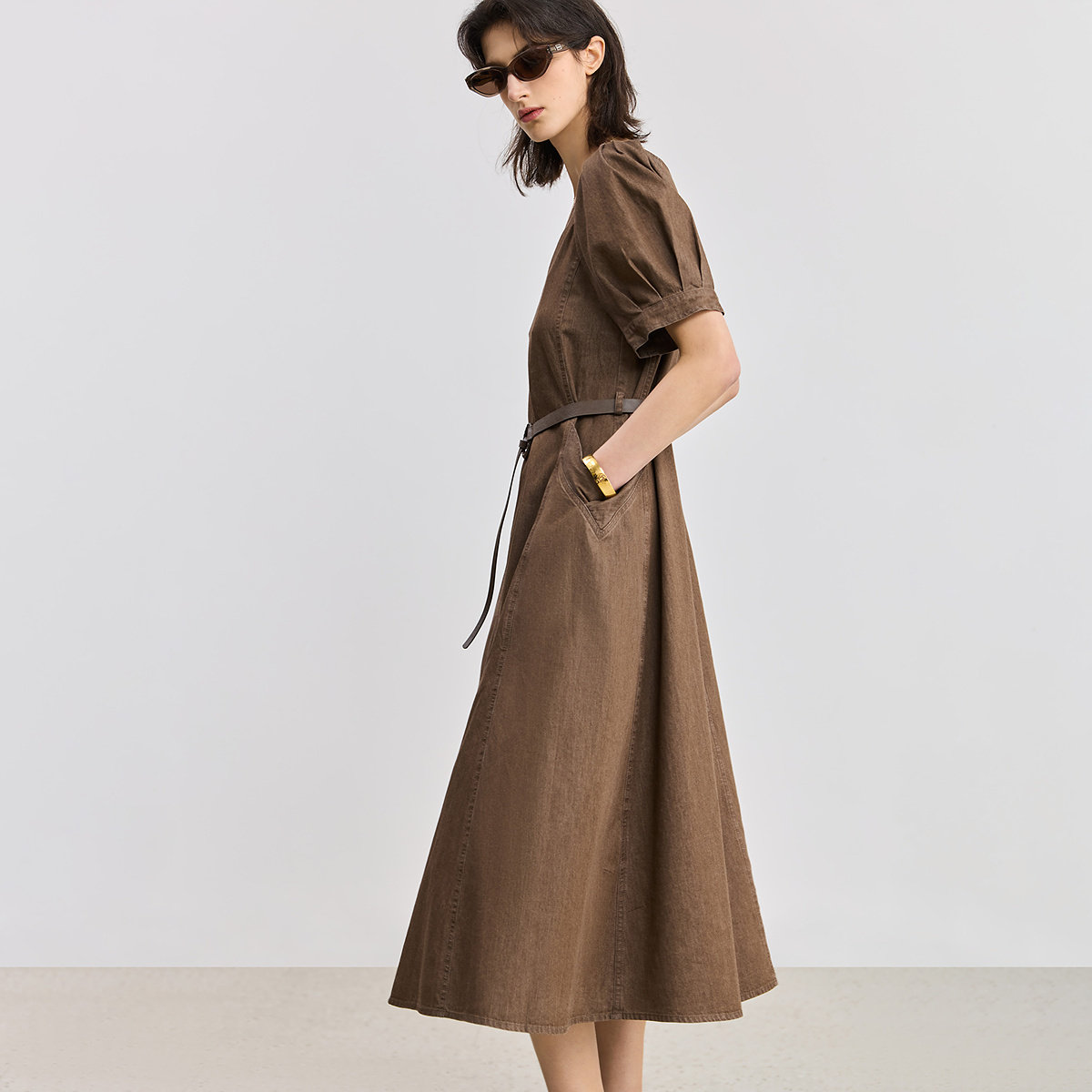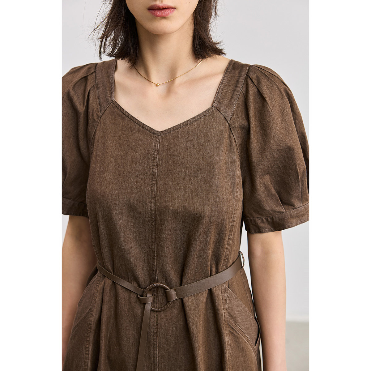 LILY2025新款复古气质全棉泡泡袖收腰休闲牛仔裙连衣裙女长裙
