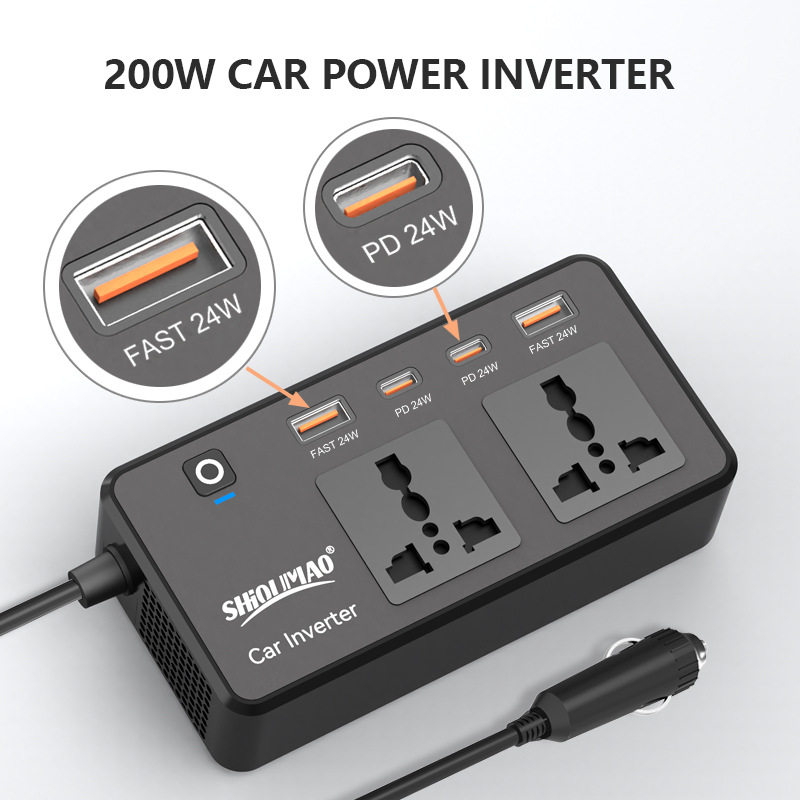 200w外贸排插智能车载逆变器 PD快充USB多功能插座汽车电源转换器