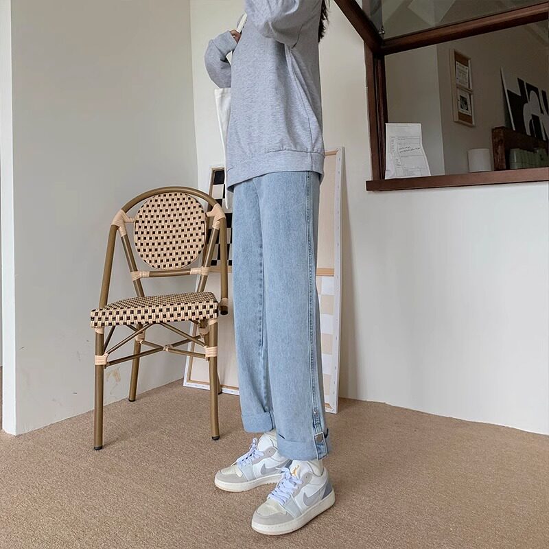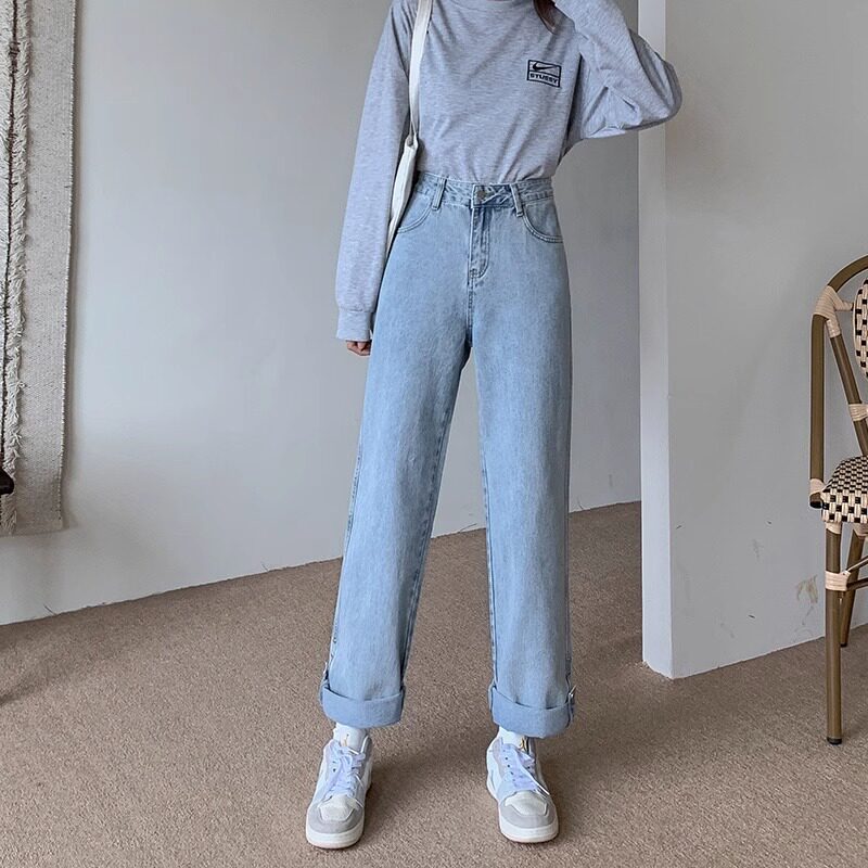 大码翻边牛仔裤女高腰显瘦直筒宽松2026新款阔腿裤潮ins卷边裤子