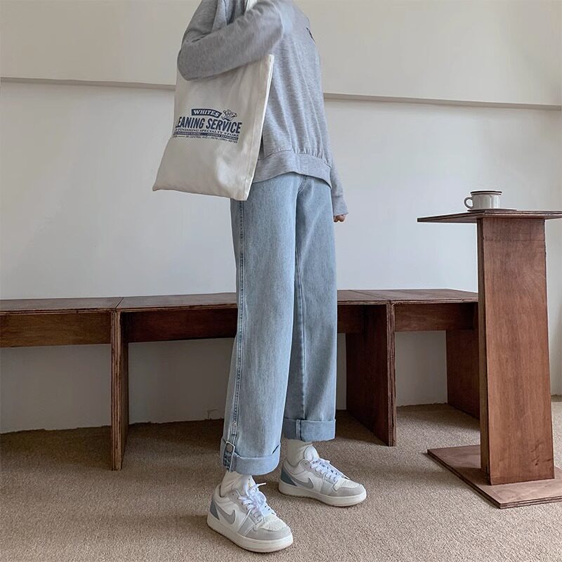 汐家女裤 春季新款大码高腰宽松阔腿拖地牛仔裤浅色系九分弯刀裤