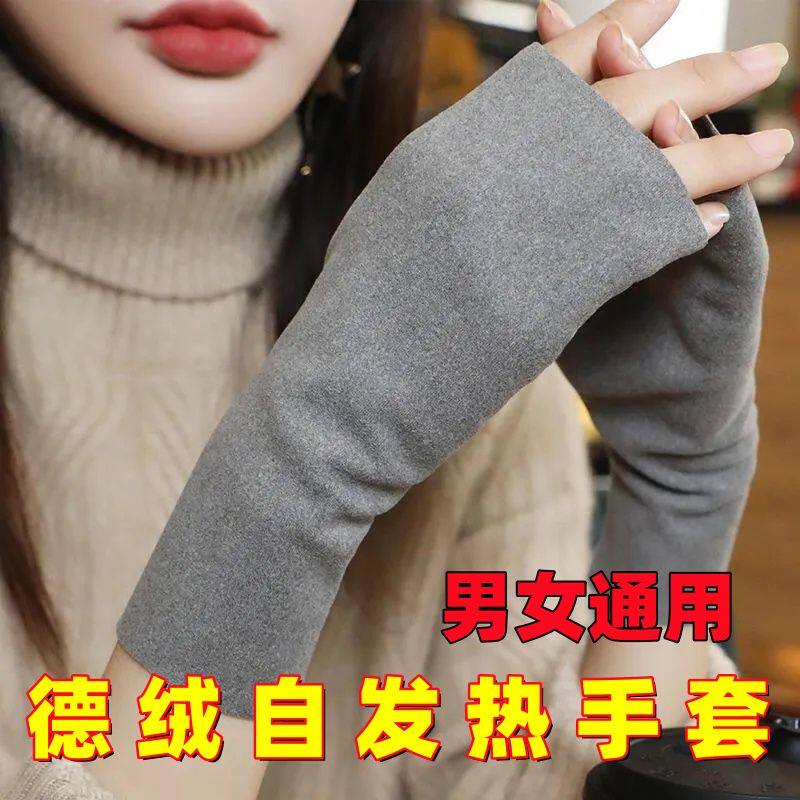 自发热德绒半指手套女秋冬季保暖防寒学生写字办公打字漏手指头