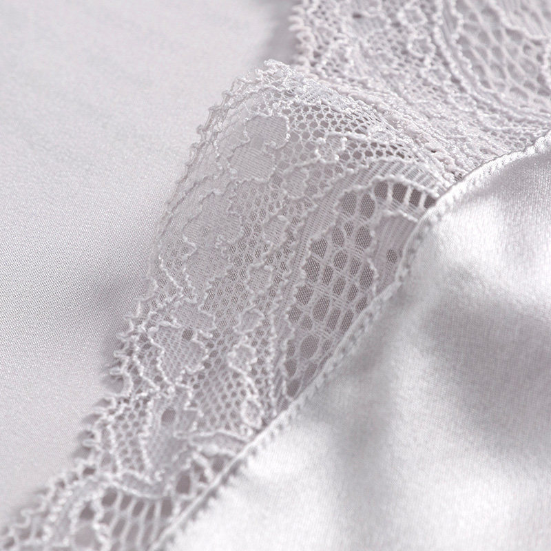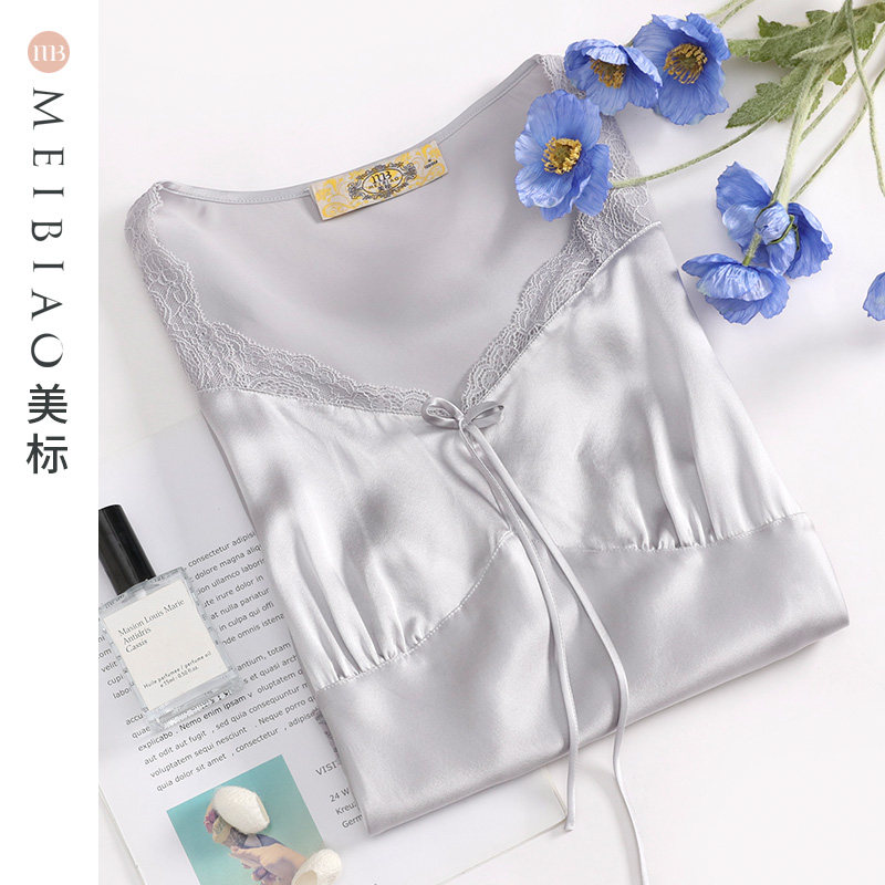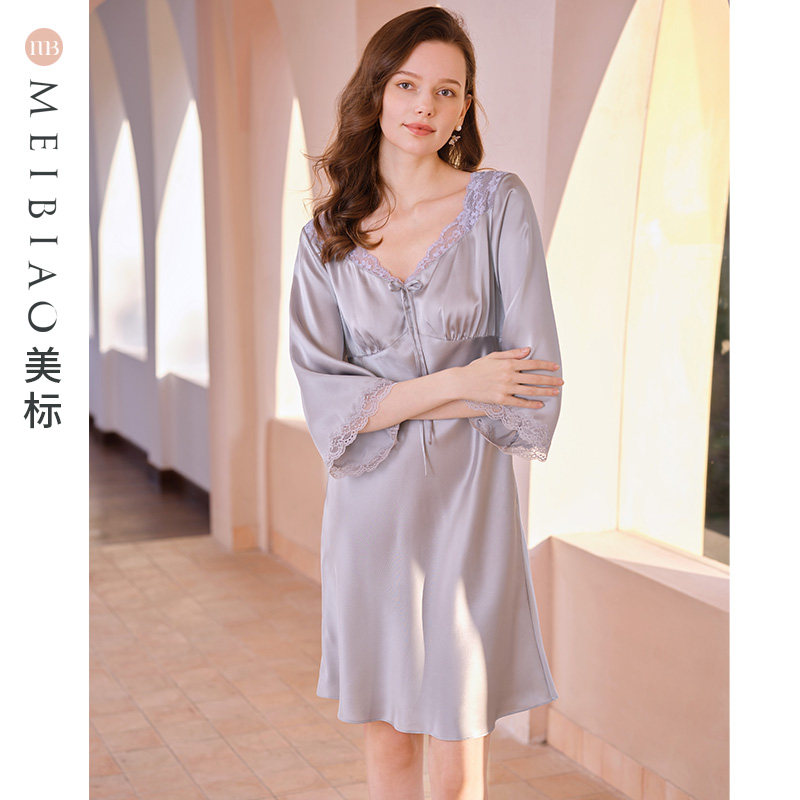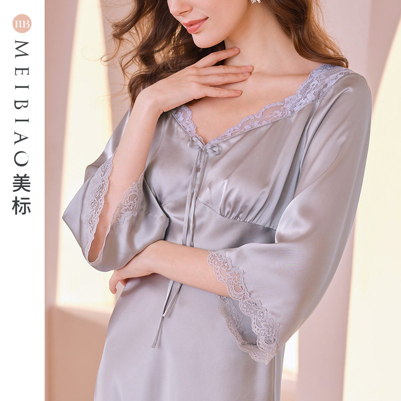 美标19姆米重磅七分袖真丝睡裙女春夏100%桑蚕丝绸睡衣蕾丝家居服