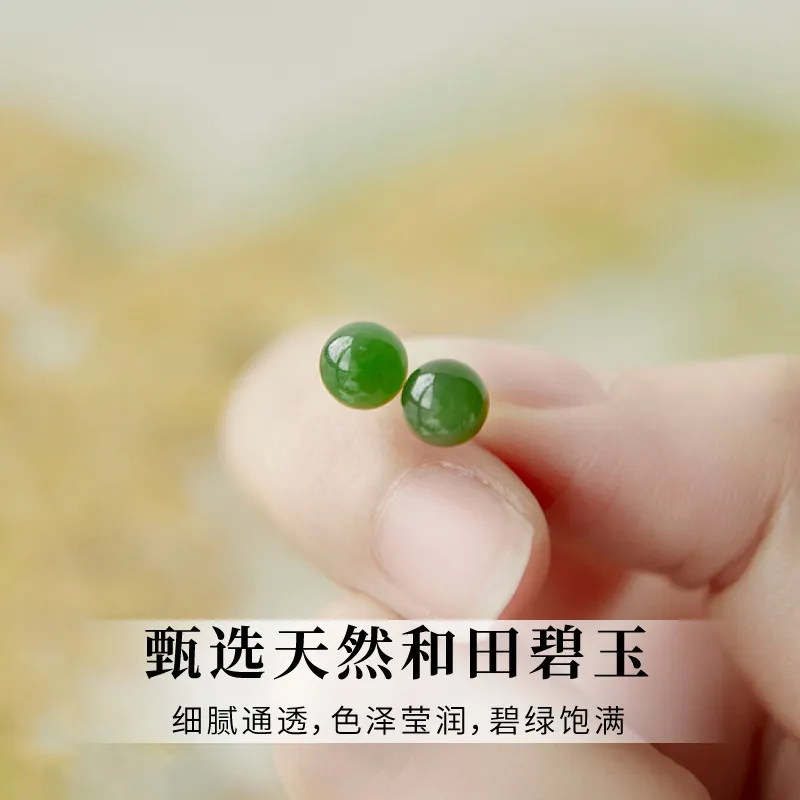 S925银耳钉天然和田玉碧玉晴水耳饰简约百搭圆珠豆豆女士纯银耳坠