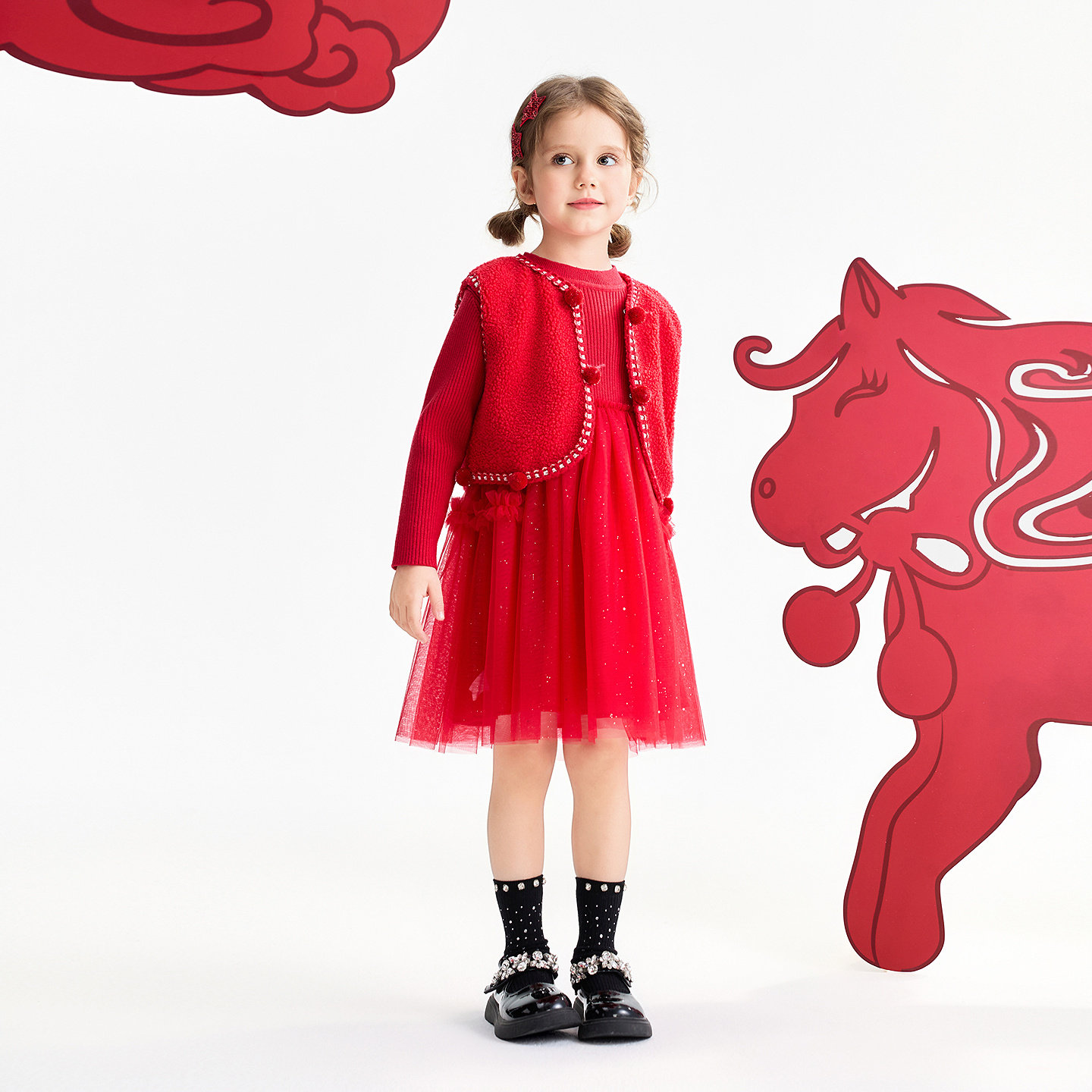 [2026新年款]女童红色连衣裙宝宝拜年服秋冬加绒蓬蓬纱裙儿童裙子