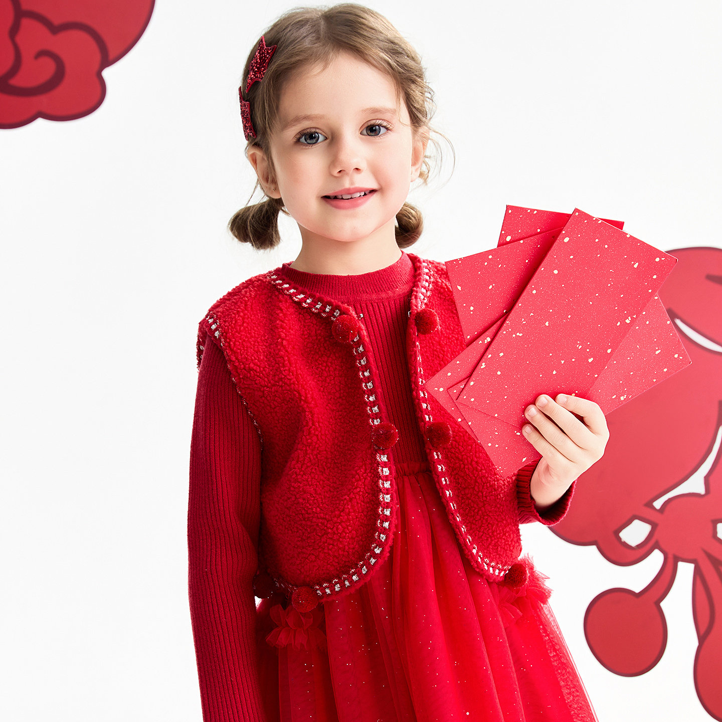 NORNOR陈大猪女童红色毛衣裙25冬款保暖好看新中式儿童年装连衣裙